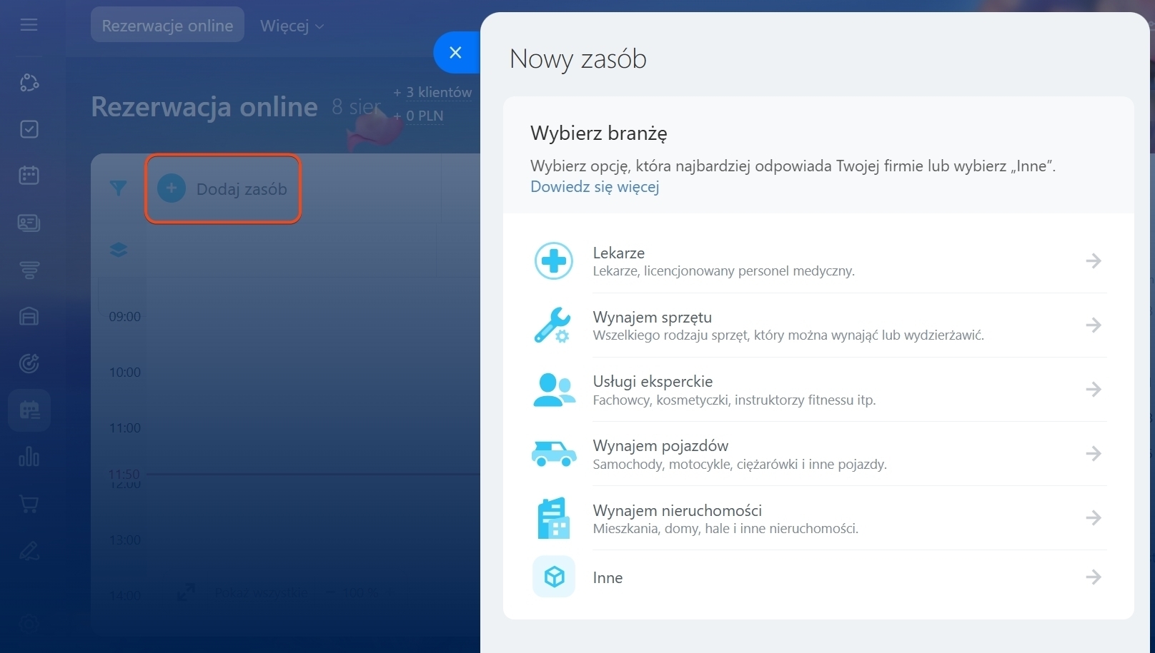 Przejdź do sekcji Rezerwacja online, kliknij Dodaj zasób i wybierz dziedzinę działalności swojej firmy. Spowoduje to automatyczne dostosowanie ustawień zasobu, oferując odpowiednie typy i szablony wiadomości, np. dla rezerwacji specjalistów lub sprzętu.
