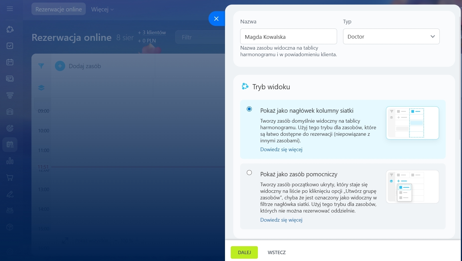 Wprowadź nazwę zasobu i jego typ. Możesz wybrać typ z listy lub utworzyć własny. Te szczegóły pojawią się na tablicy harmonogramu i będą uwzględnione w wiadomościach dla klientów.