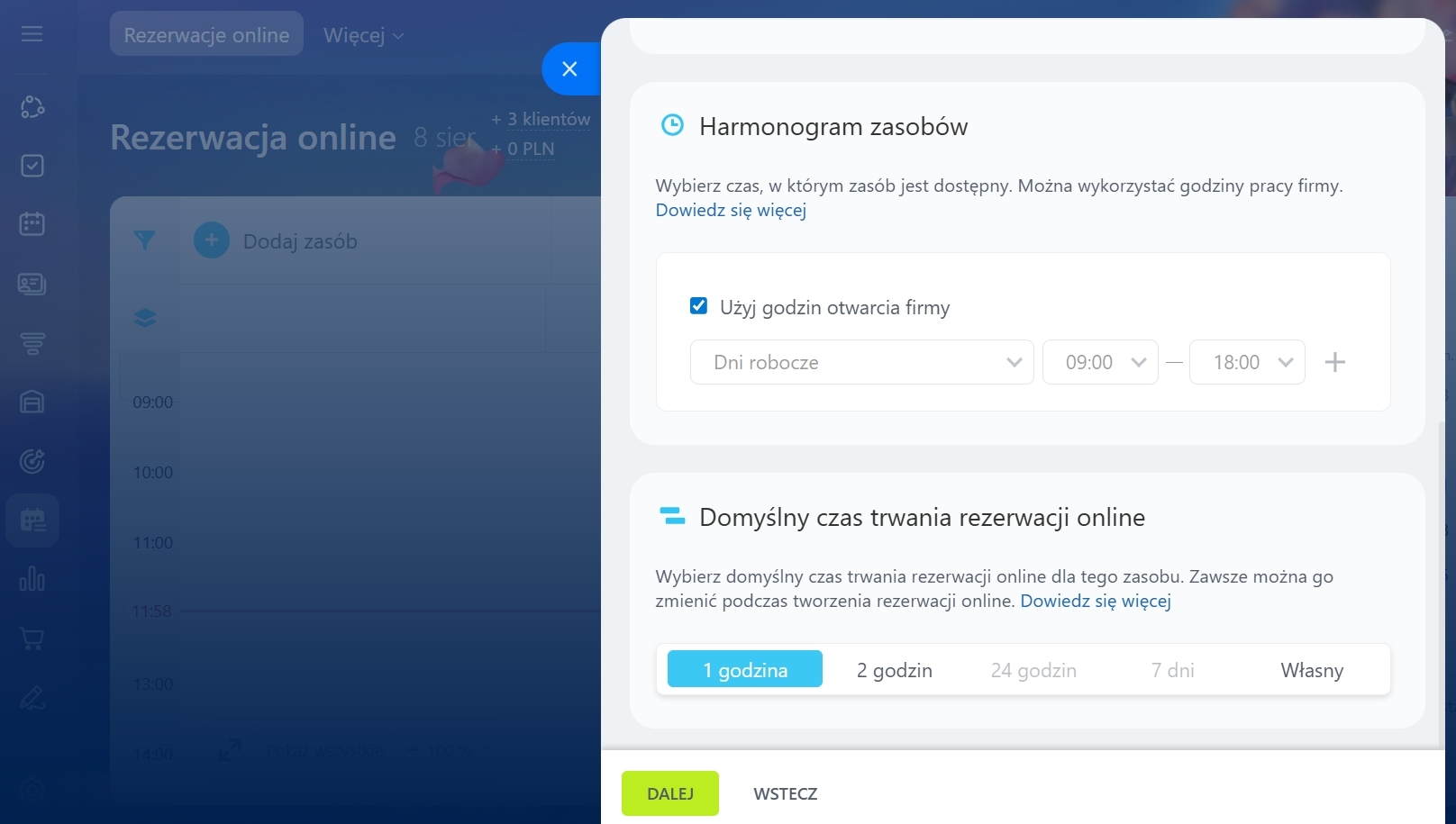 Skonfiguruj godziny pracy i określ dostępność zasobu do rezerwacji. Możesz zastosować godziny pracy firmy lub ustawić indywidualny harmonogram, elastycznie określając dostępność na dowolny dzień tygodnia.
