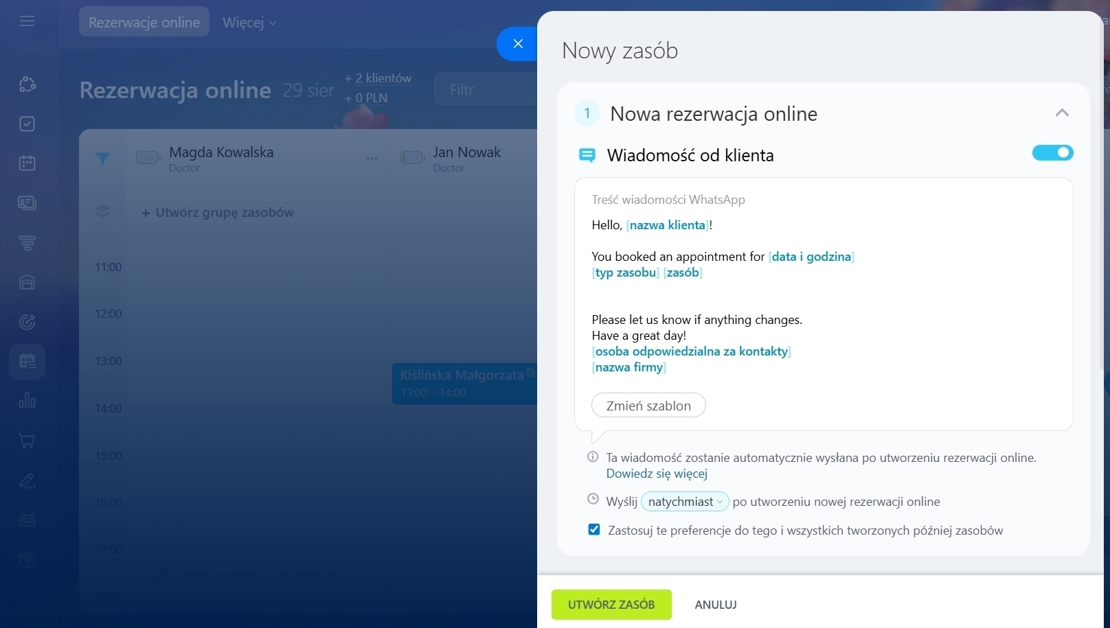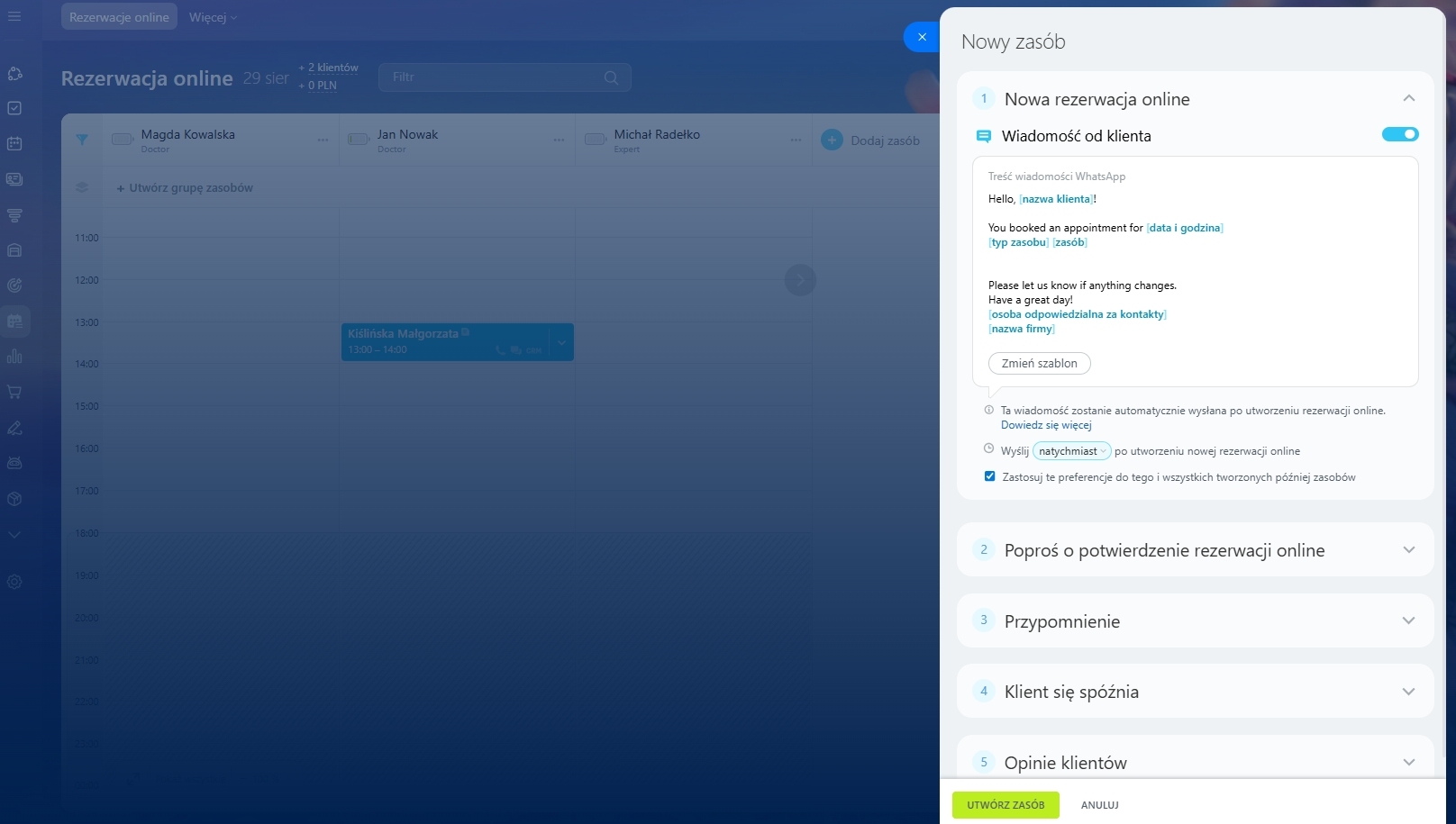 Skonfiguruj automatyczne wiadomości, aby informować klientów o nowych rezerwacjach, prosić o potwierdzenie, wysyłać przypomnienia o wizytach lub powiadamiać o spóźnieniach.