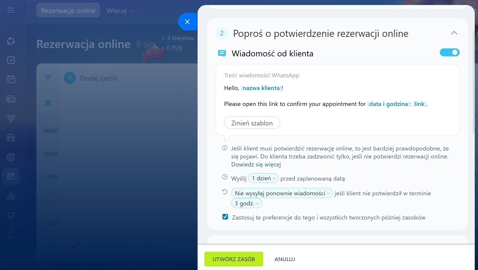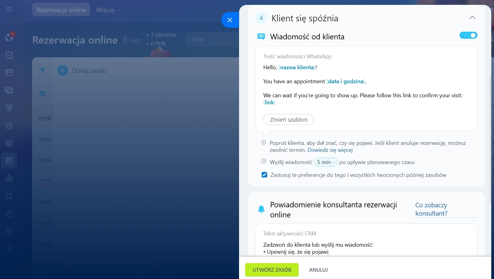 Określ, kiedy powiadomić osobę odpowiedzialną za rezerwacje, np. trzy godziny przed spotkaniem, jeśli rezerwacja nie została potwierdzona. Dzięki temu pracownik może skontaktować się z klientem i wyjaśnić jego plany.