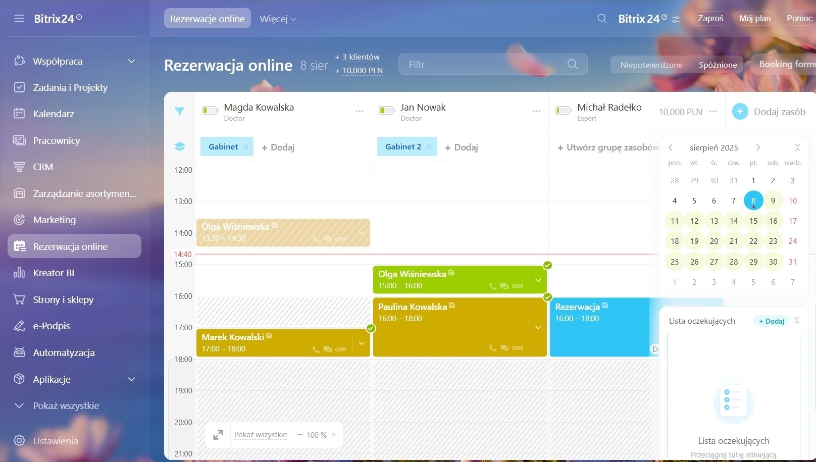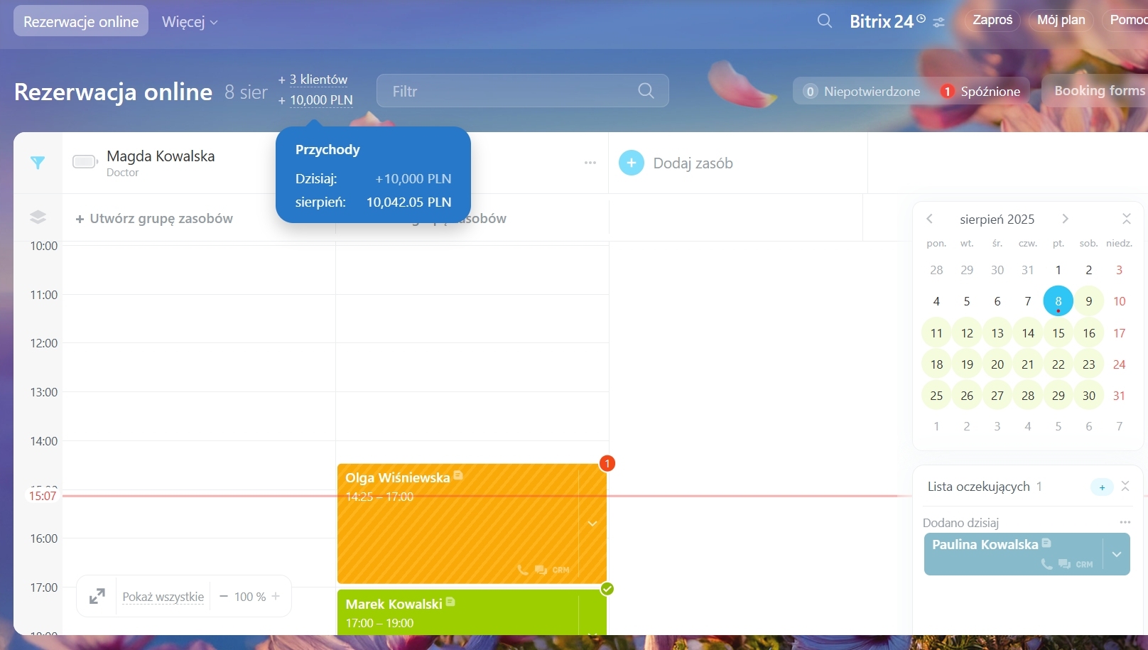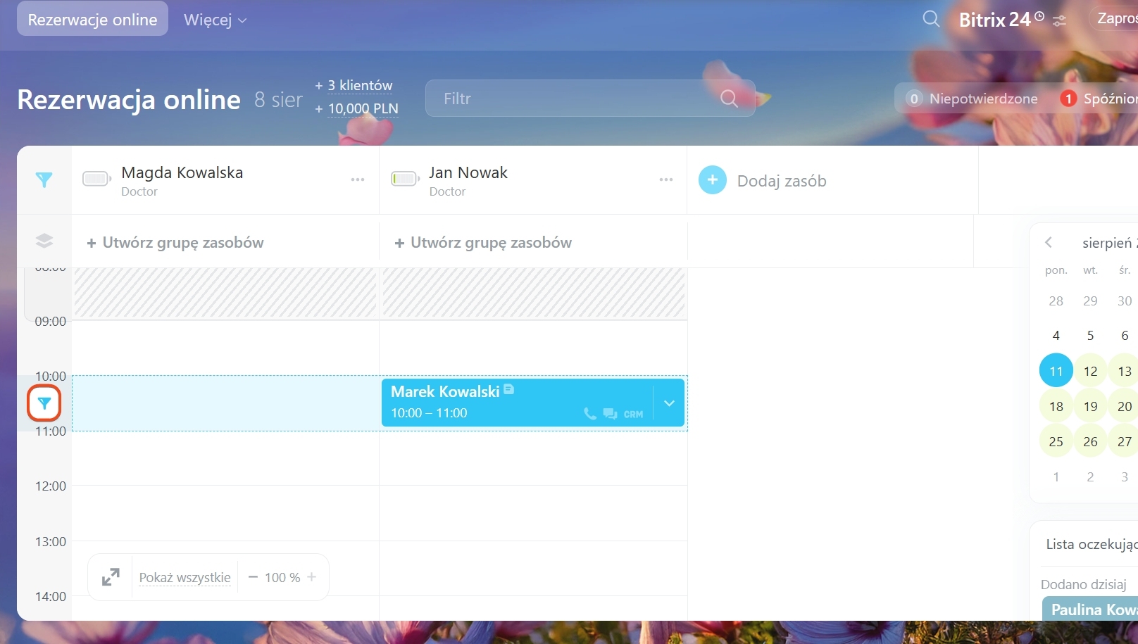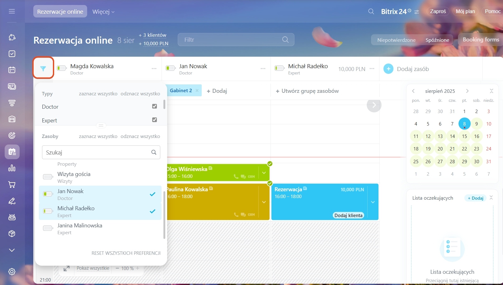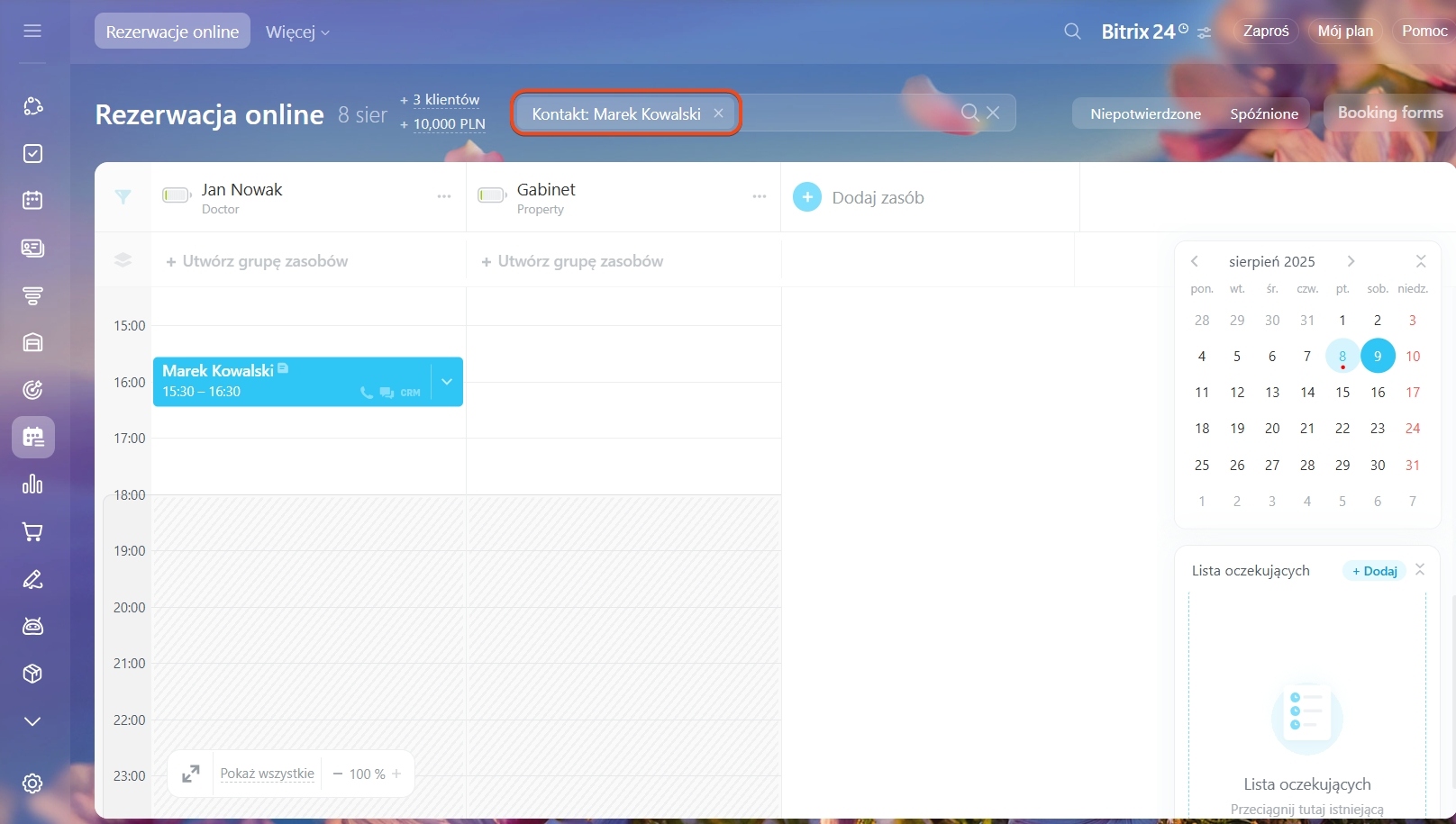 Na przykład zastosuj filtr „Kontakt”, aby zobaczyć rezerwacje konkretnego klienta na wybraną datę i wyróżnić dni w kalendarzu, gdy ma inne spotkania.