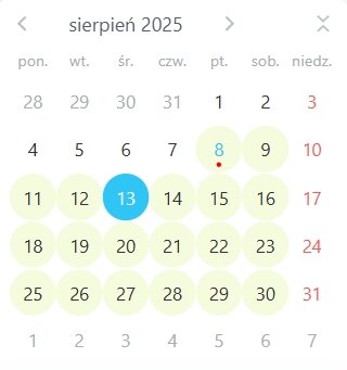 — Czarny: Minione dni lub brak dostępnych terminów.