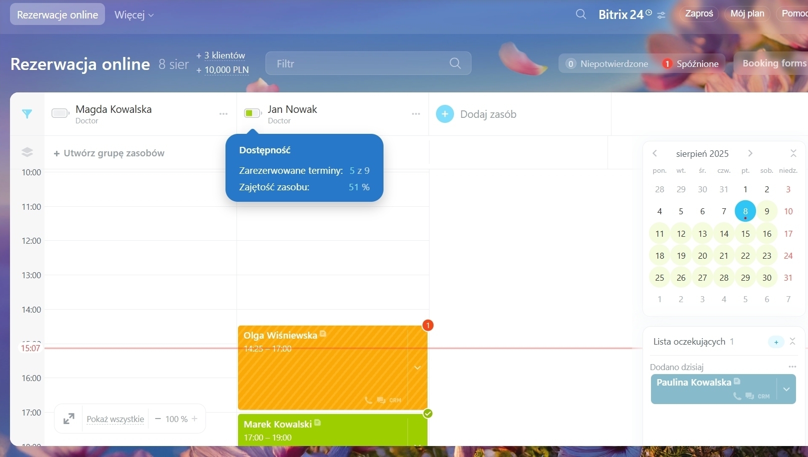Jeśli wielu klientów zarezerwuje ten sam termin, jest on wyróżniony na ciemnopomarańczowo. Nadmiar rezerwacji pomaga zapewnić efektywne wykorzystanie zasobów, nawet jeśli jeden z klientów anuluje wizytę.