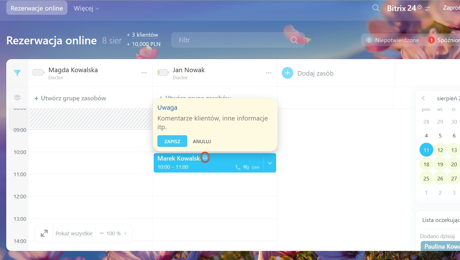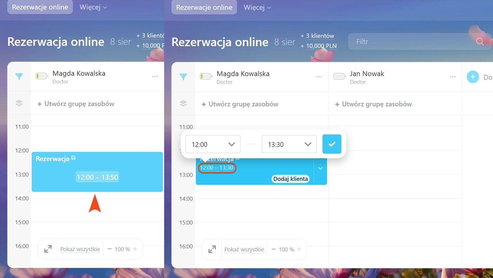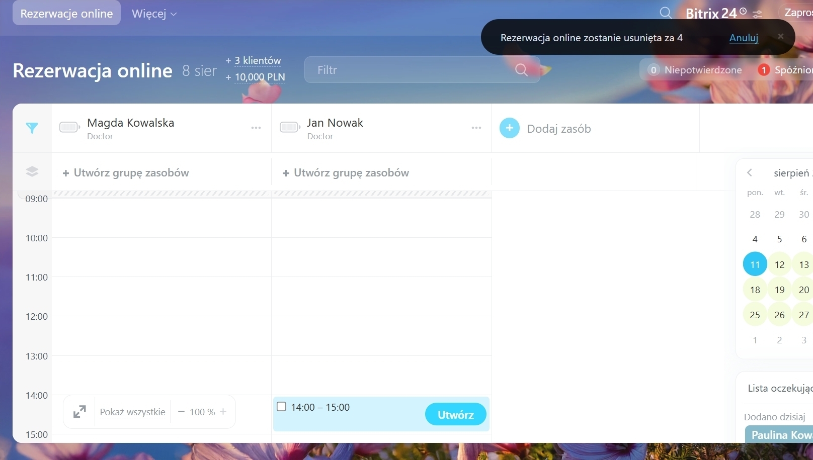 Jeśli klient się spóźnia, rezerwacja zmienia kolor na pomarańczowy. W przypadku braku potwierdzenia wizyty pojawi się licznik niepowodzenia, informujący pracownika o konieczności kontaktu z klientem.