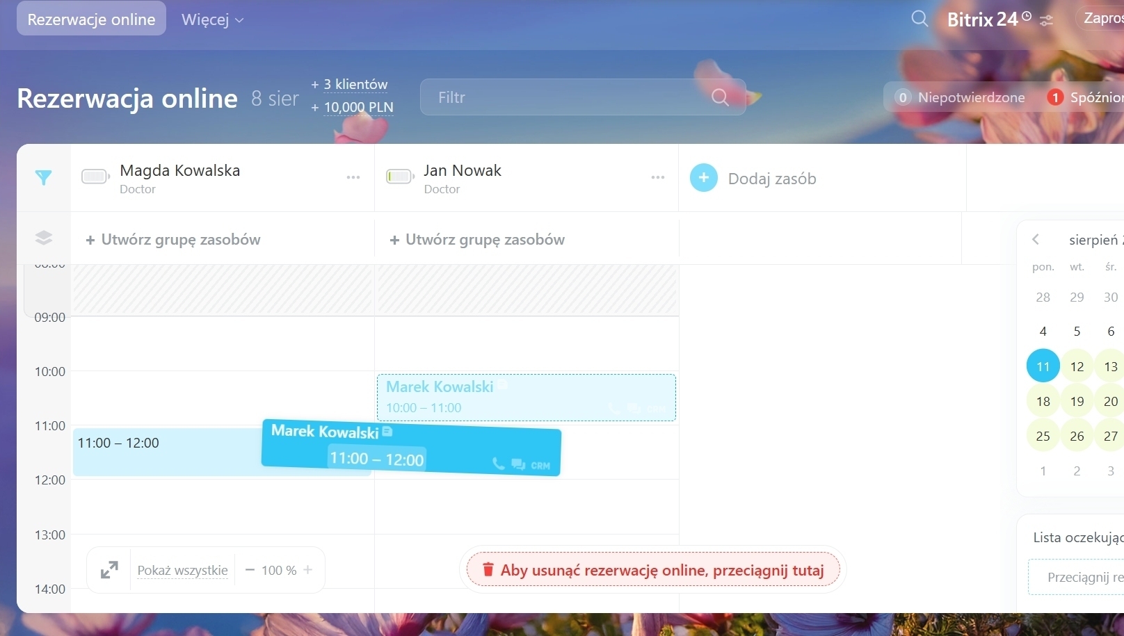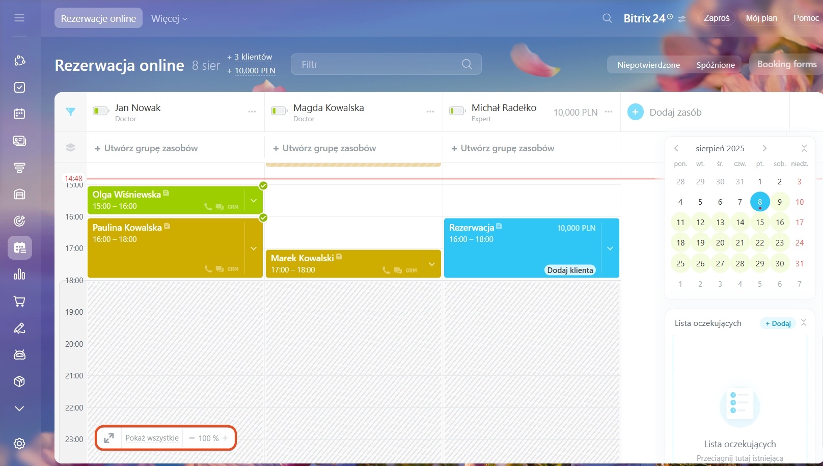 Jeśli rezerwacje nie mieszczą się na ekranie, dostosuj poziom powiększenia (–100%+). Użyj przycisku „Pokaż wszystkie”, aby wyświetlić wszystkie zasoby i szybko sprawdzić ich wykorzystanie.