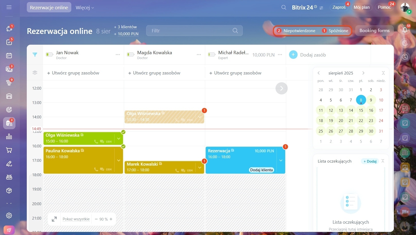 — Czerwona kropka pod datą: Rezerwacje wymagające uwagi.