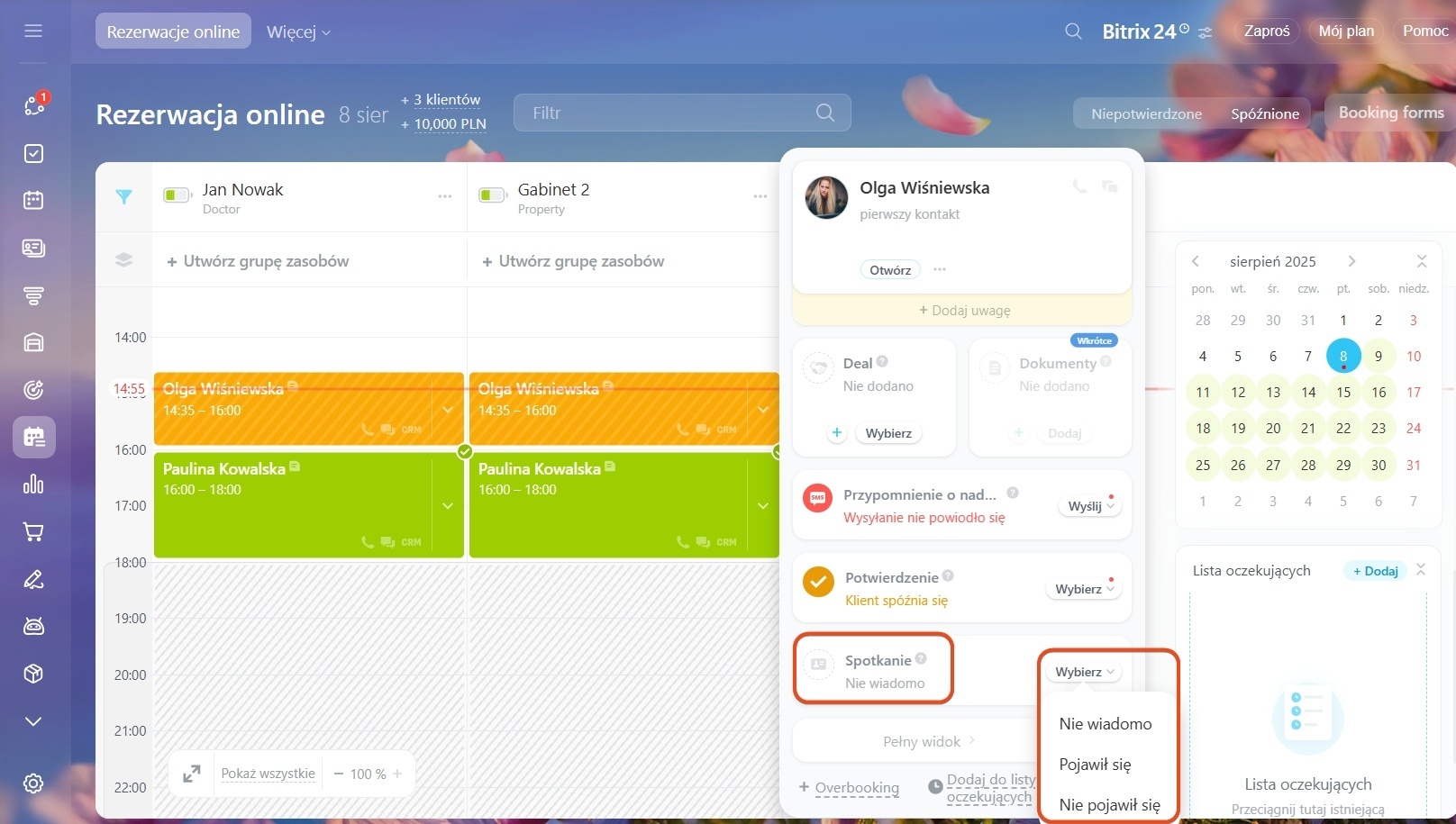 Aby śledzić obecność w tablicy harmonogramu, kliknij strzałkę obok rezerwacji, wybierz „Spotkanie” i oznacz status jako „Pojawił się” lub „Nie pojawił się”.