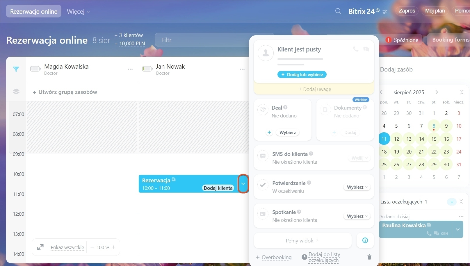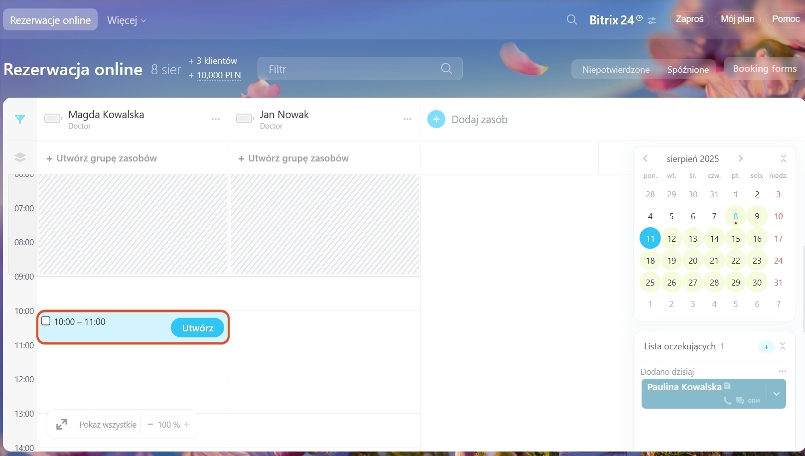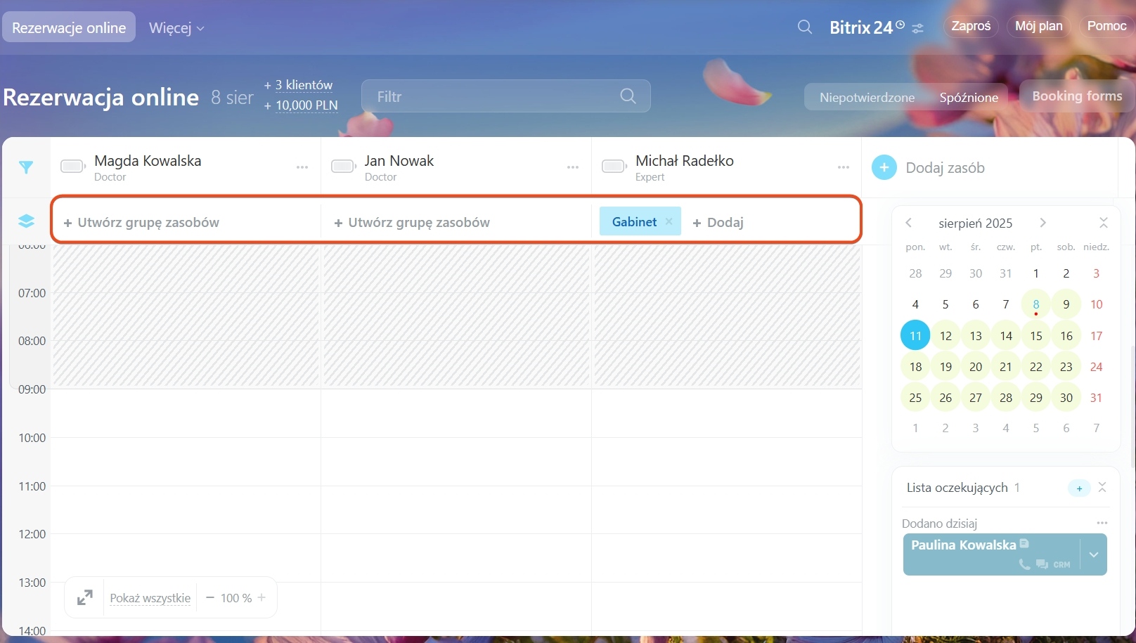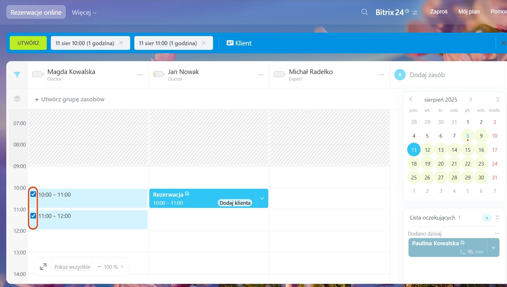 Po otrzymaniu prośby pracownik otwiera sekcję Rezerwacja online w Bitrix24 i wybiera wolny termin w kolumnie odpowiedniego zasobu.