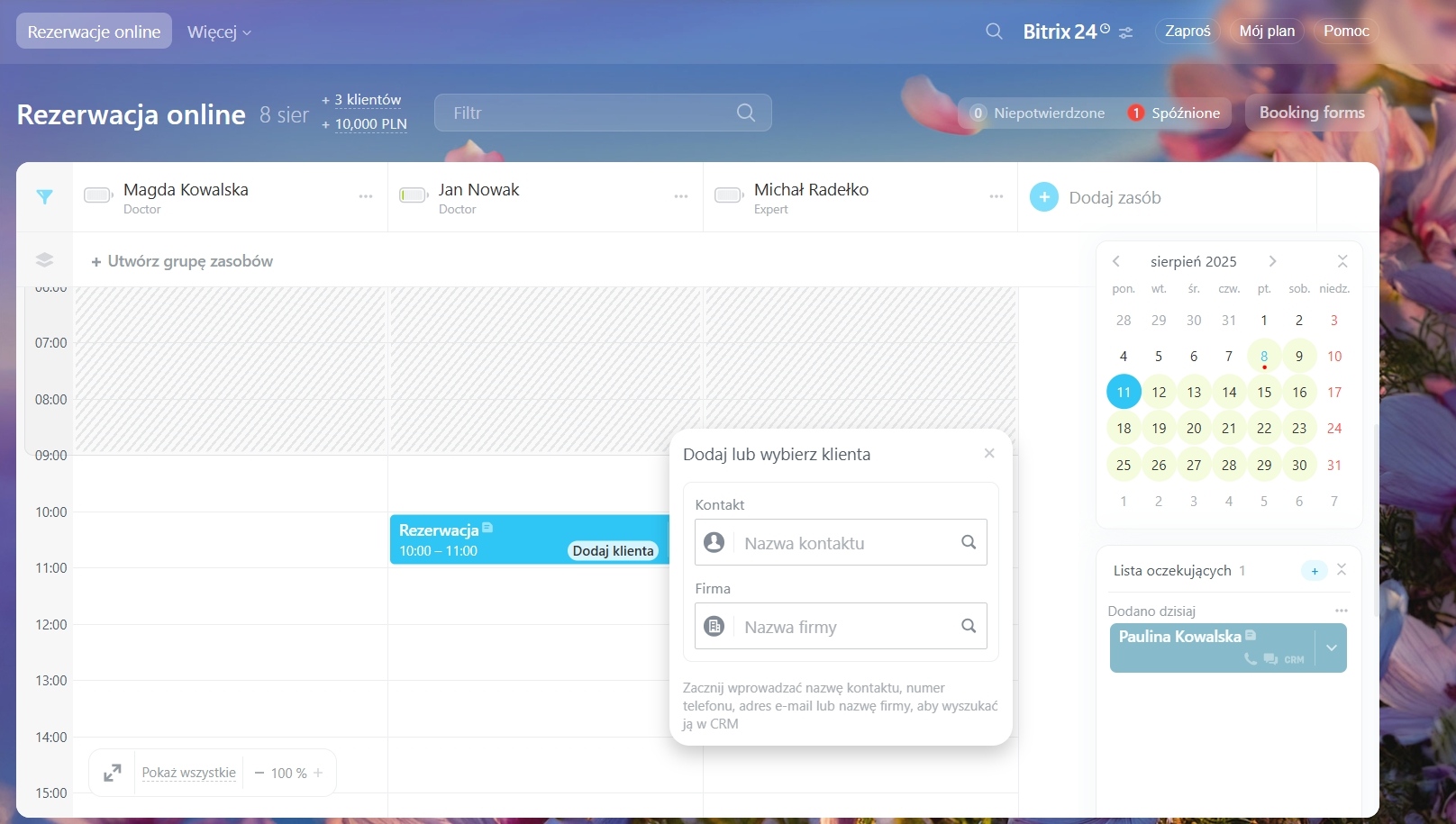 Jeśli kontakt lub firma istnieje już w CRM, dodaj je do rezerwacji. Jeśli nie, utwórz nowy element. Dane zostaną zapisane w CRM, co pomoże w rozwoju bazy klientów. Dzięki temu później możesz skontaktować się z nimi, aby zaproponować nowe usługi lub poinformować o aktualizacjach.