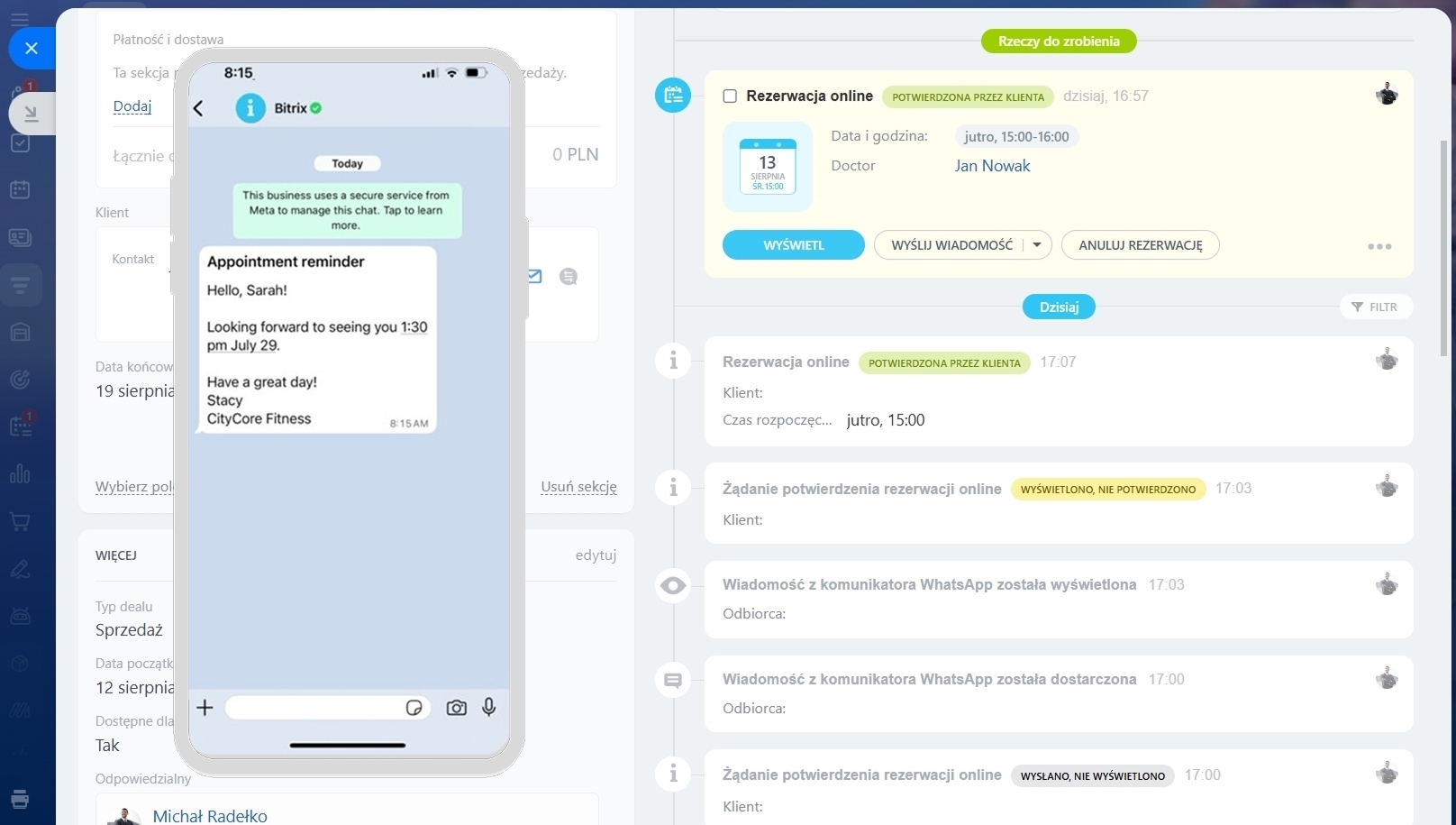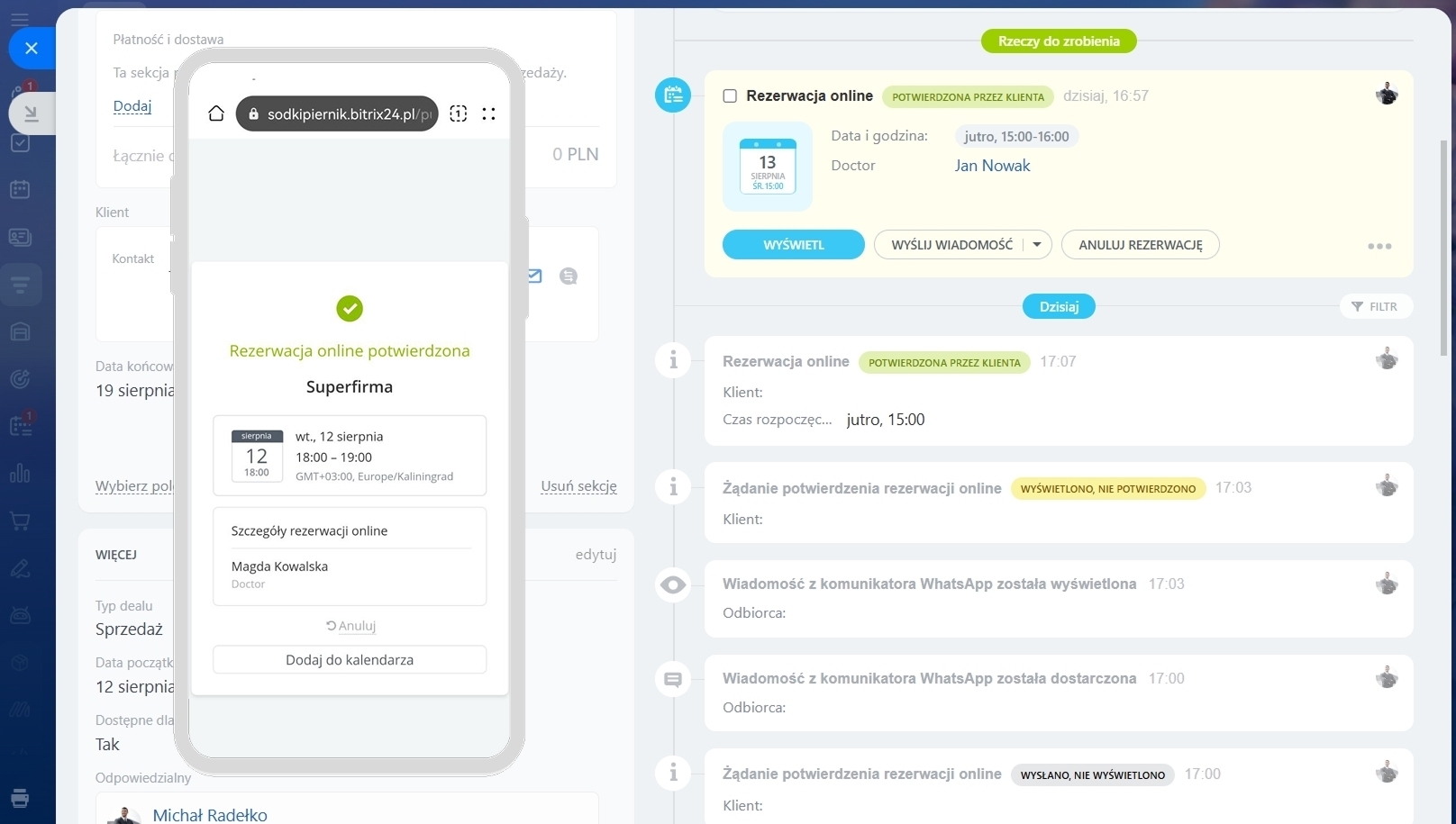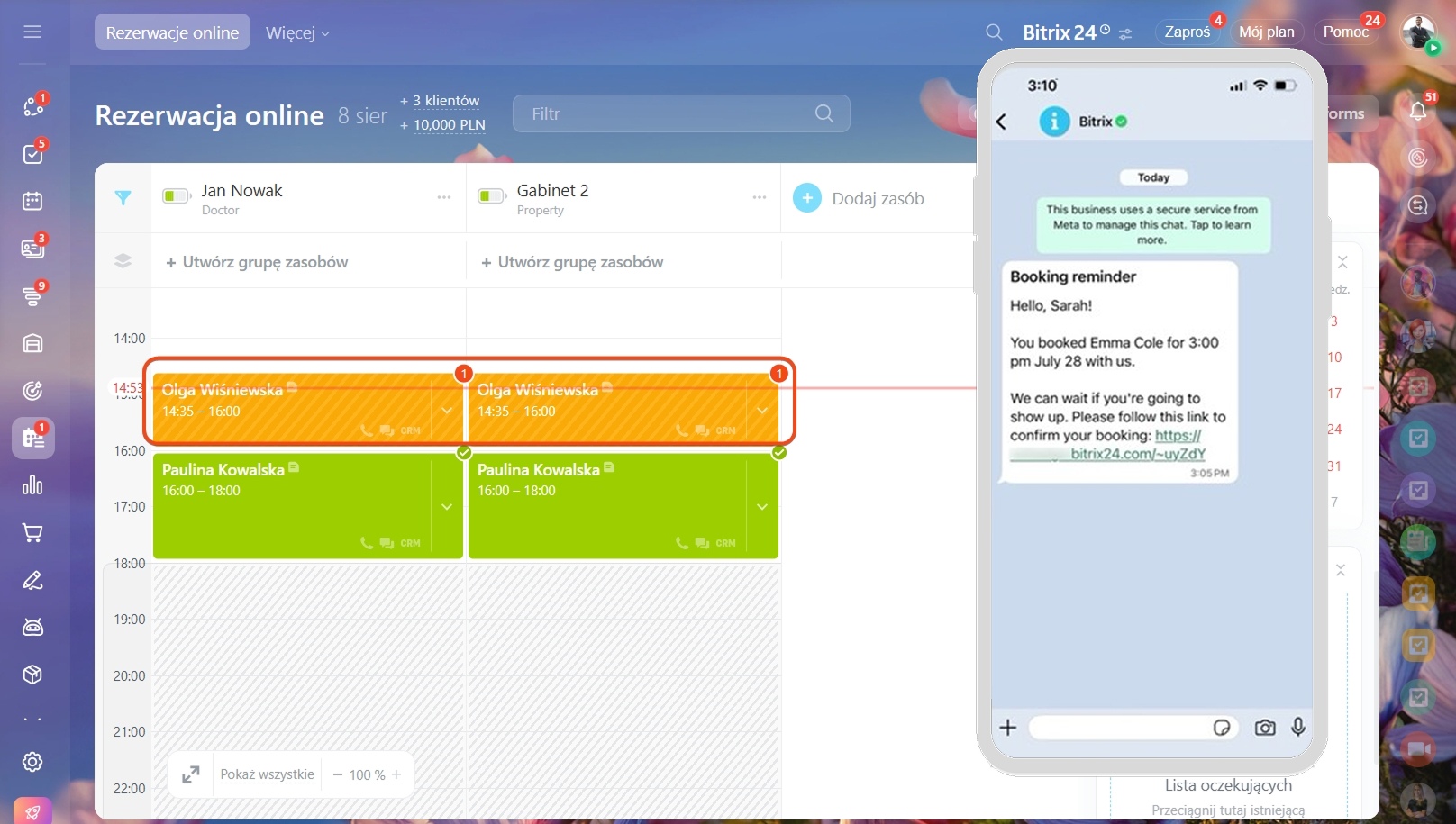 Niezależnie od wybranej metody Bitrix24 automatycznie wysyła wiadomości, aby zminimalizować liczbę nieobecności i przypomnieć klientom o spotkaniu.
