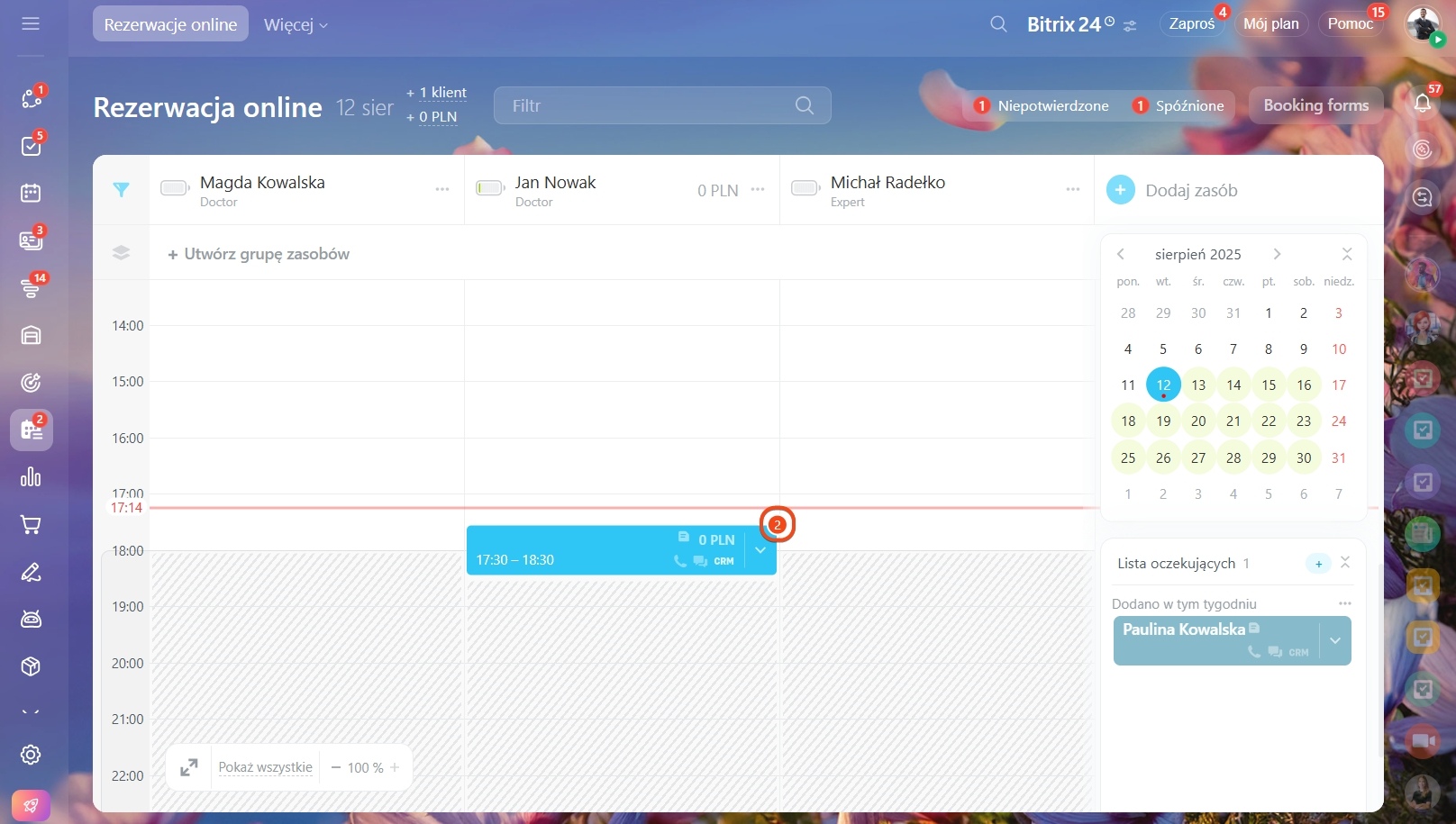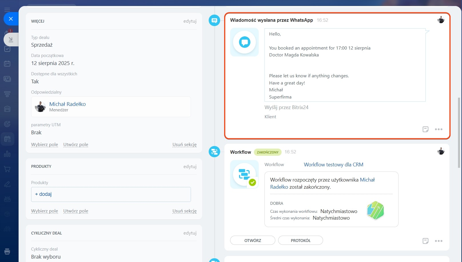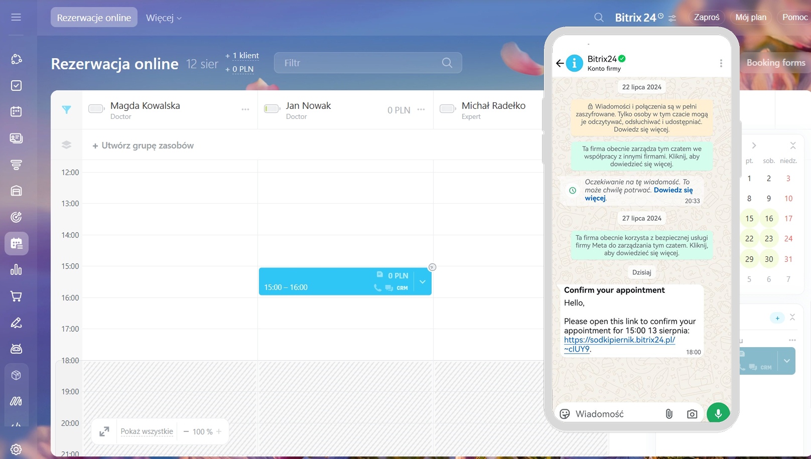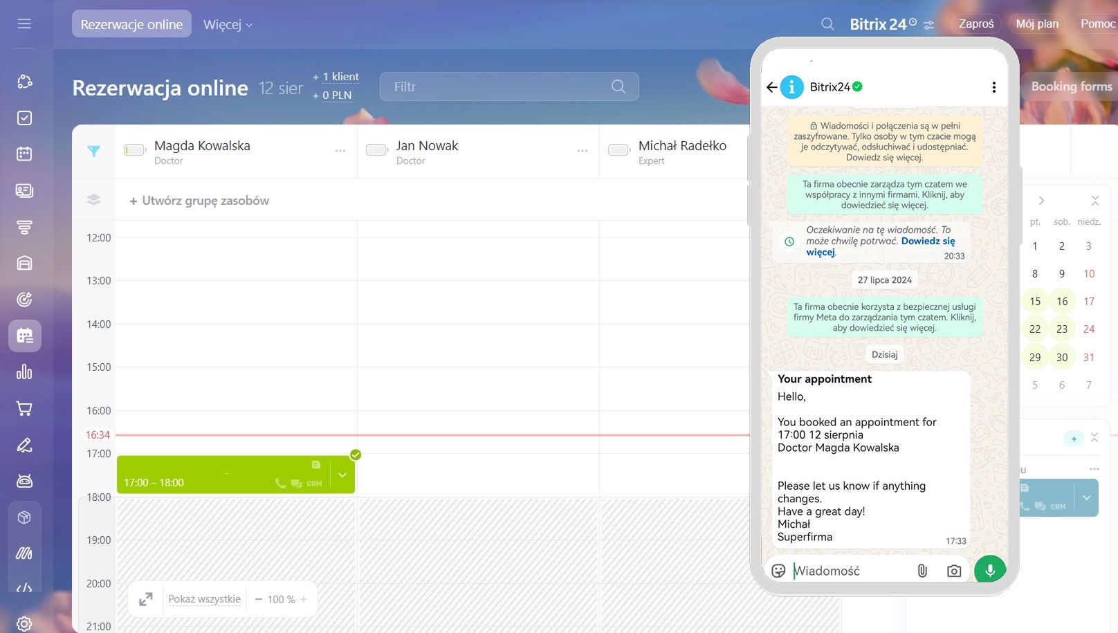 Niezależnie od wybranej metody Bitrix24 automatycznie wysyła wiadomości, aby zminimalizować liczbę nieobecności i przypomnieć klientom o spotkaniu.