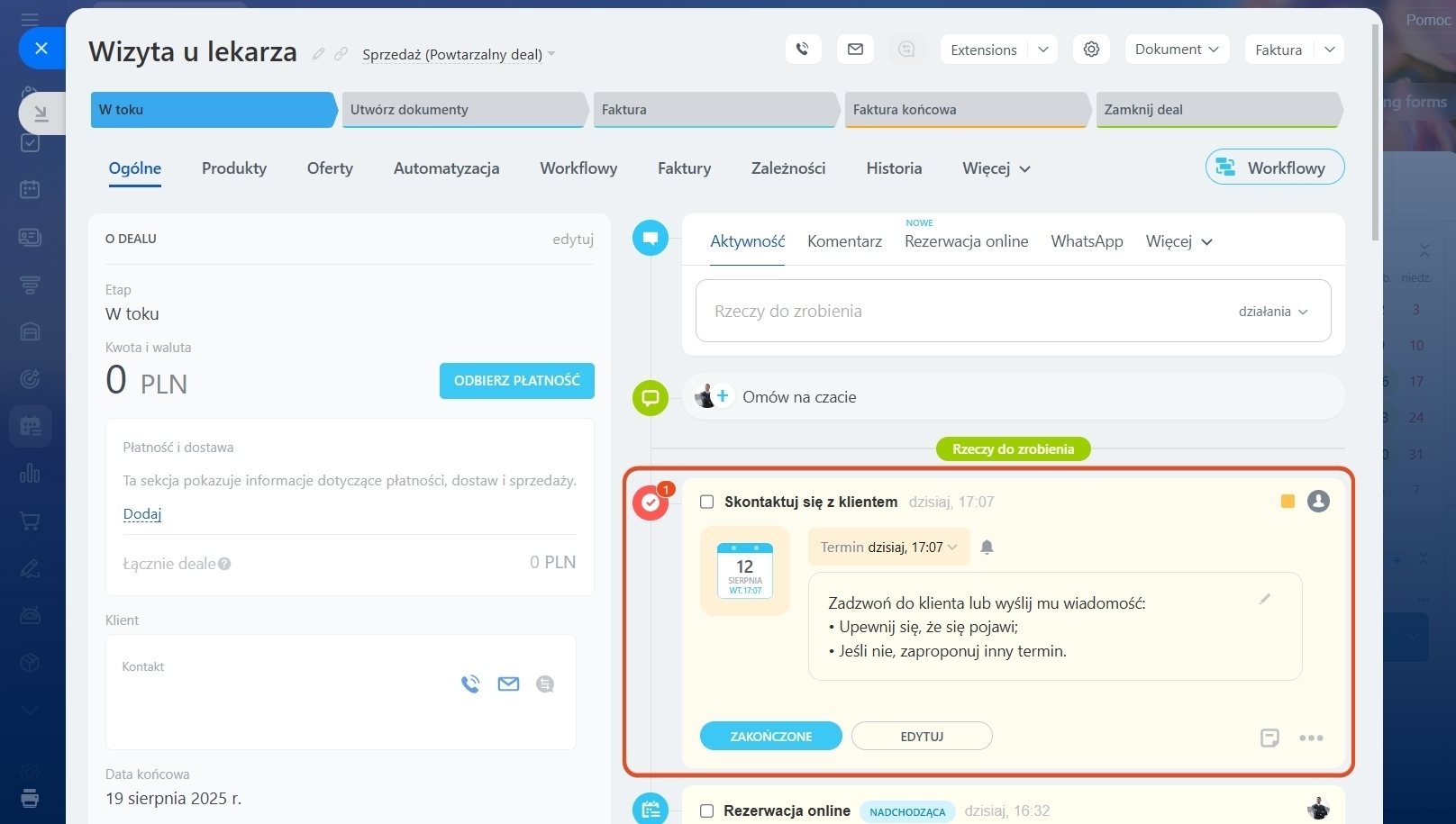 Jeśli rezerwacja nadal nie zostanie potwierdzona, system automatycznie utworzy aktywność w CRM, przypominając pracownikowi o kontakcie z klientem.