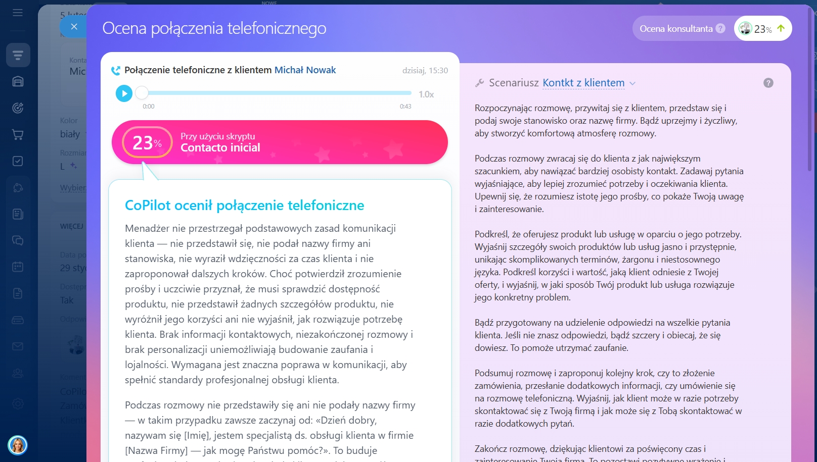 CoPilot może stać się osobistym trenerem rozwoju dla każdego z Twoich handlowców – szczególnie dzięki sprawdzaniu rozmów pod kątem skryptów sprzedażowych i natychmiastowemu feedbackowi z konkretnymi rekomendacjami.