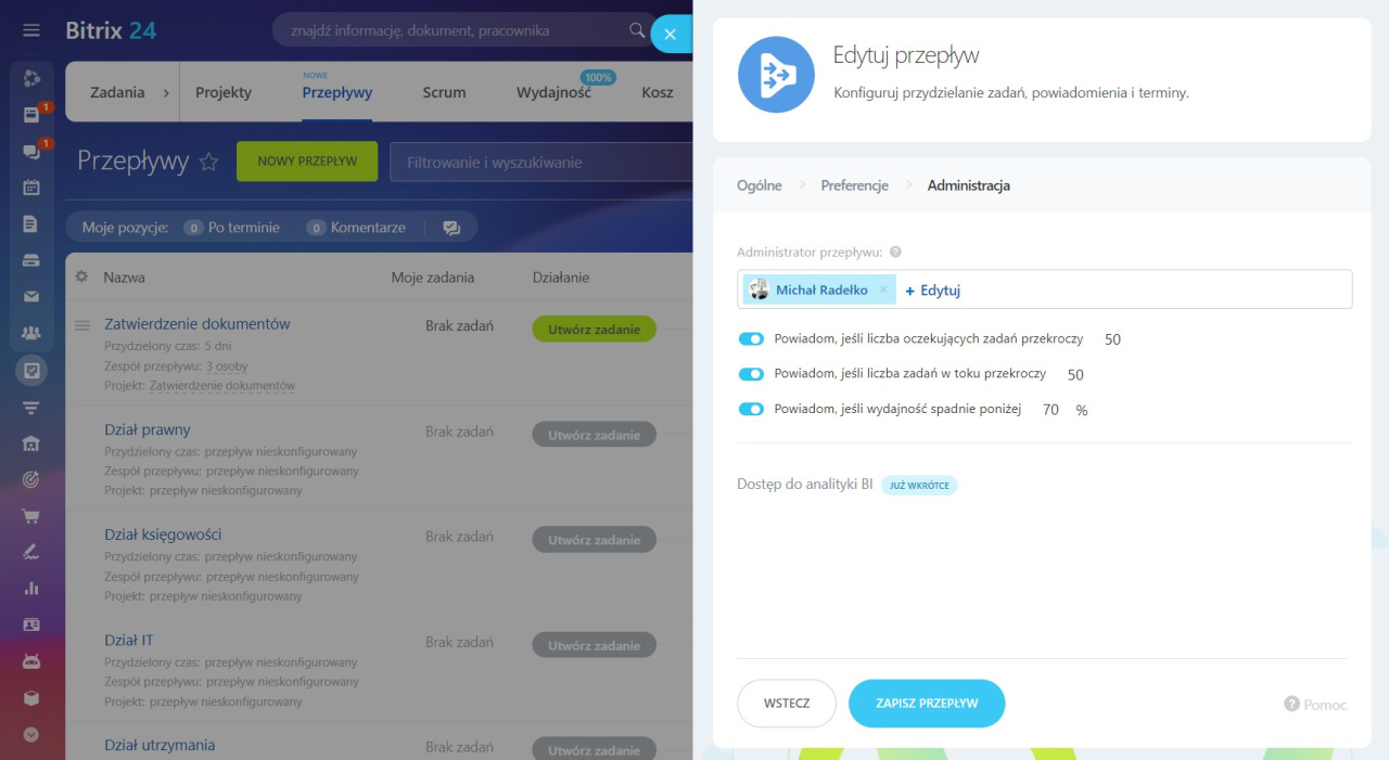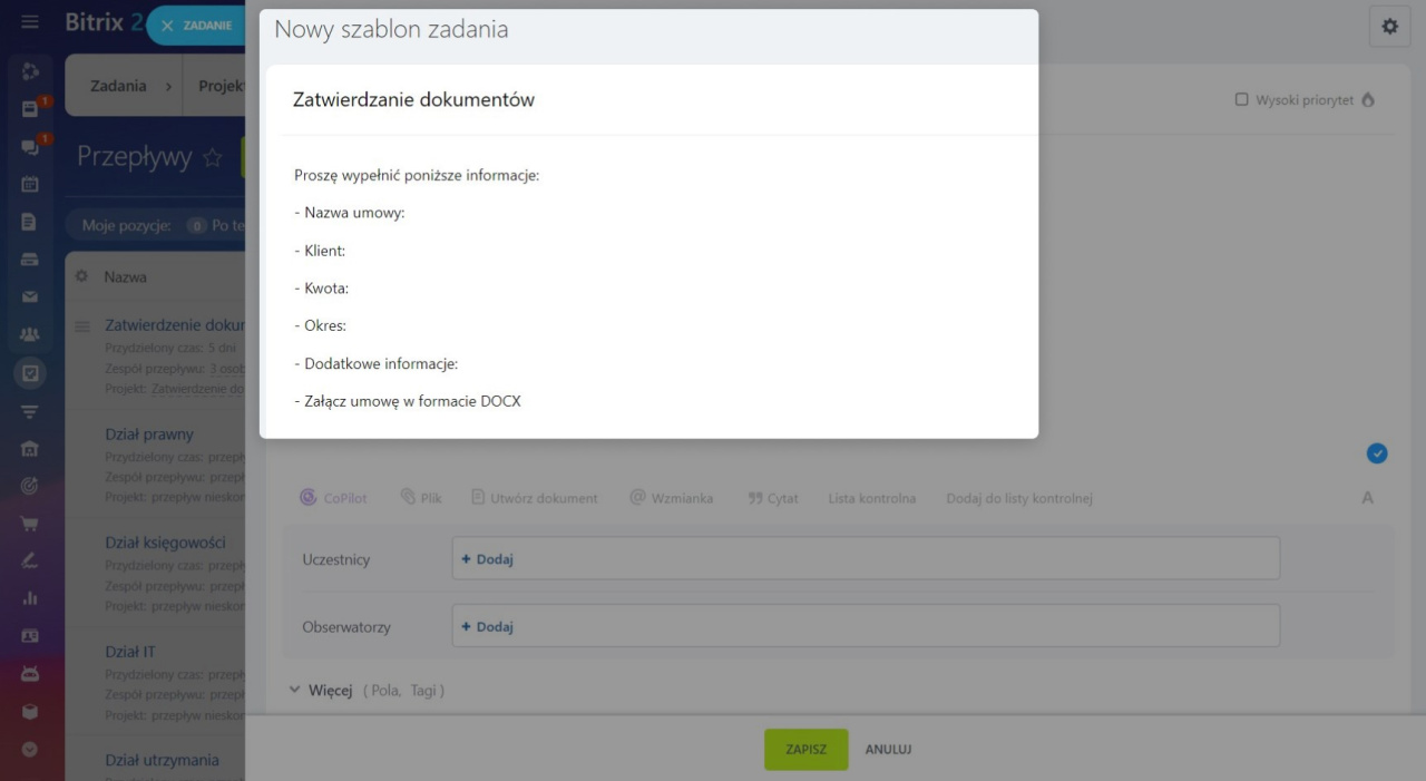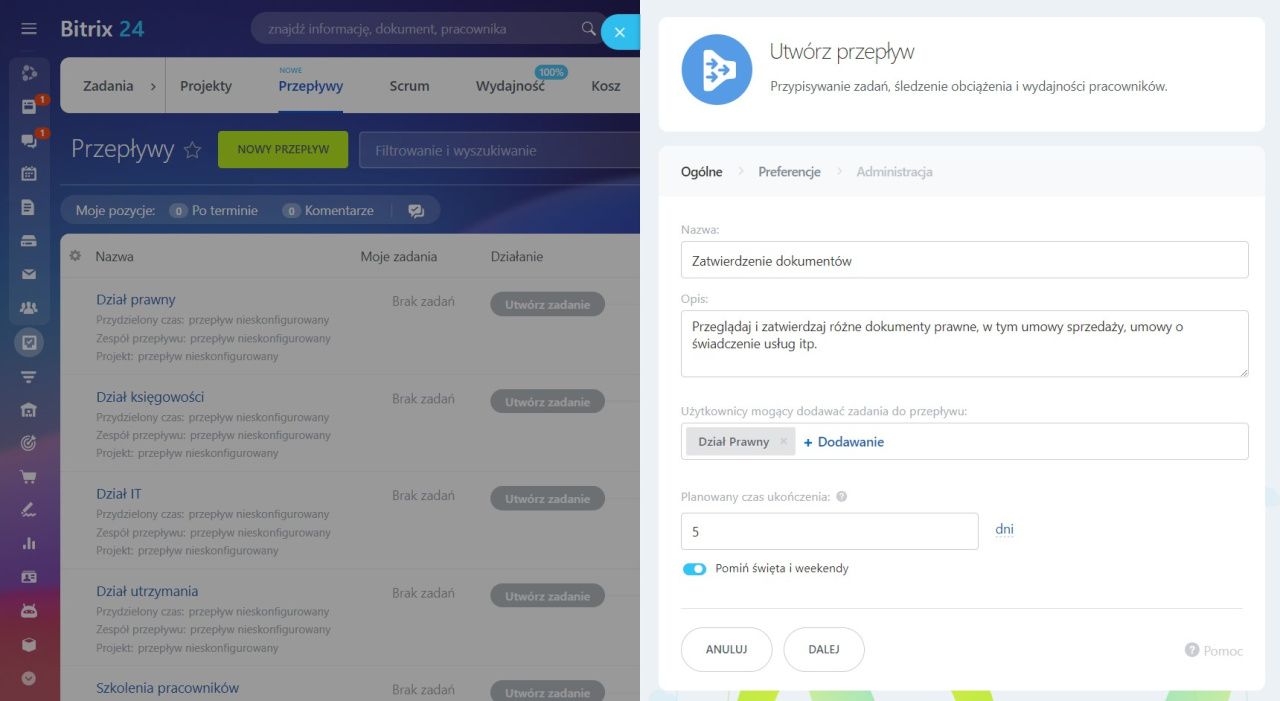 Jako przykład weźmy proces zatwierdzania umów zakupowych i innych dokumentów prawnych i stwórzmy nasz pierwszy Przepływ w Bitrix24. Wystarczy przejść przez 4 proste kroki.