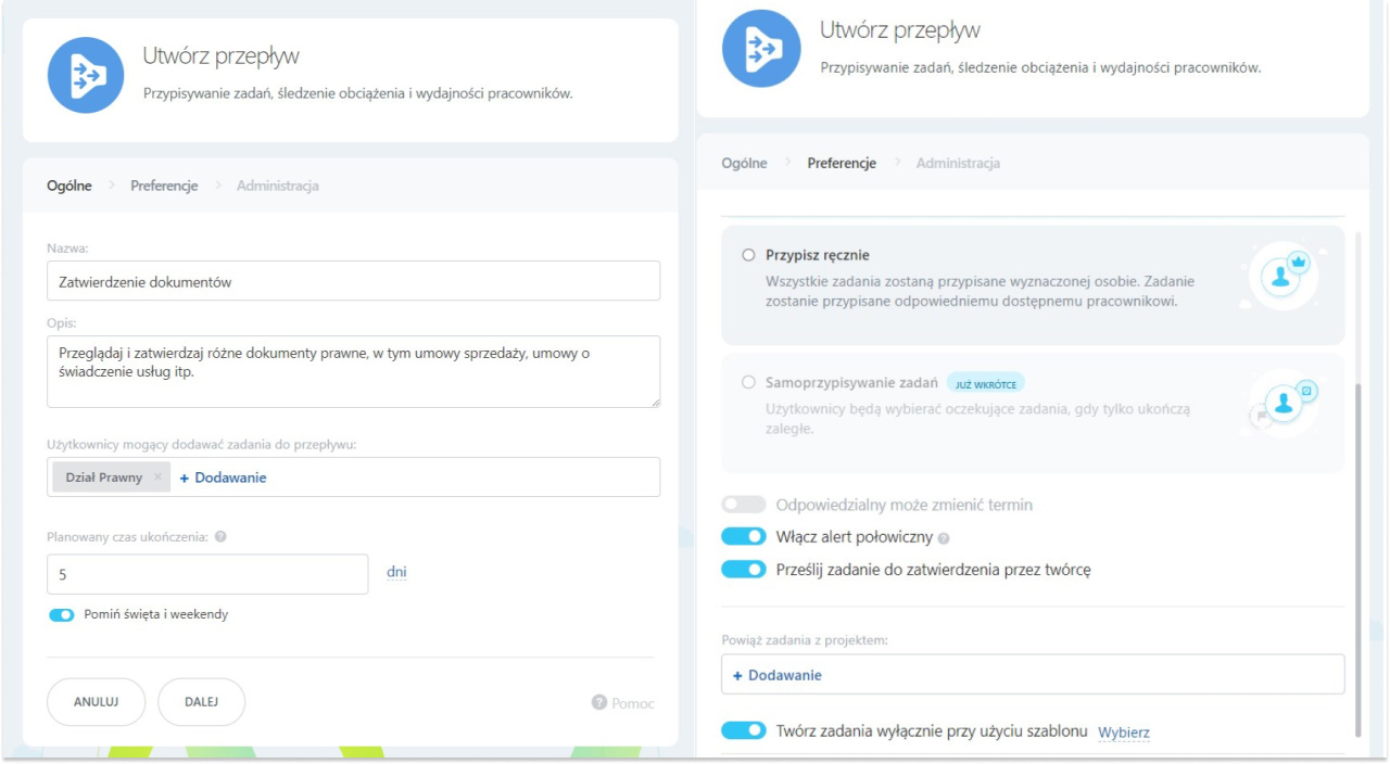 W tym miejscu należy również zdecydować, kto może dodawać zadania do Przepływu (wszyscy pracownicy czy tylko określone osoby) oraz określić planowany czas wykonania zadań. Gdy zadanie zostanie dodane do Przepływu, jego termin zostanie automatycznie obliczony i ustawiony na podstawie planowanego czasu wykonania.
