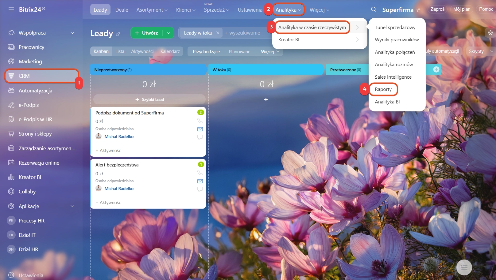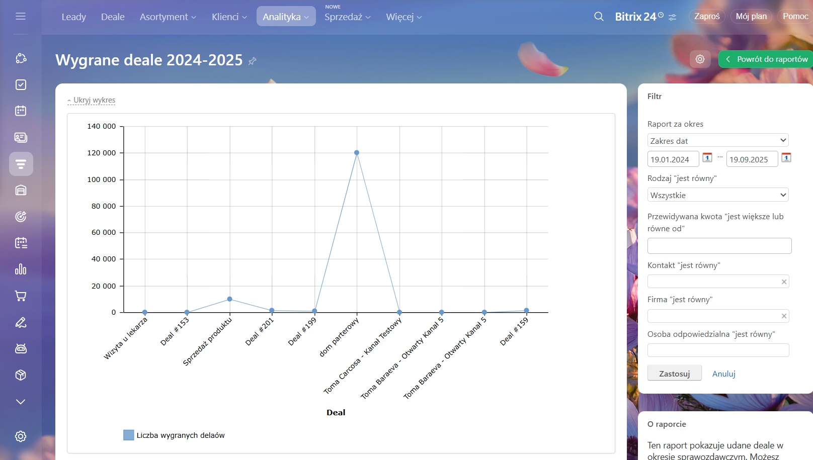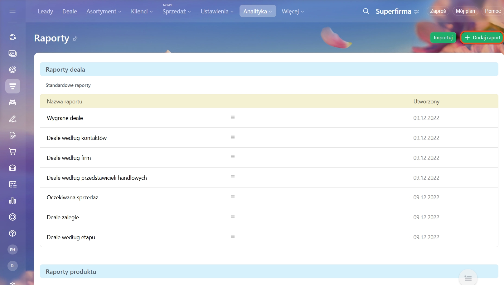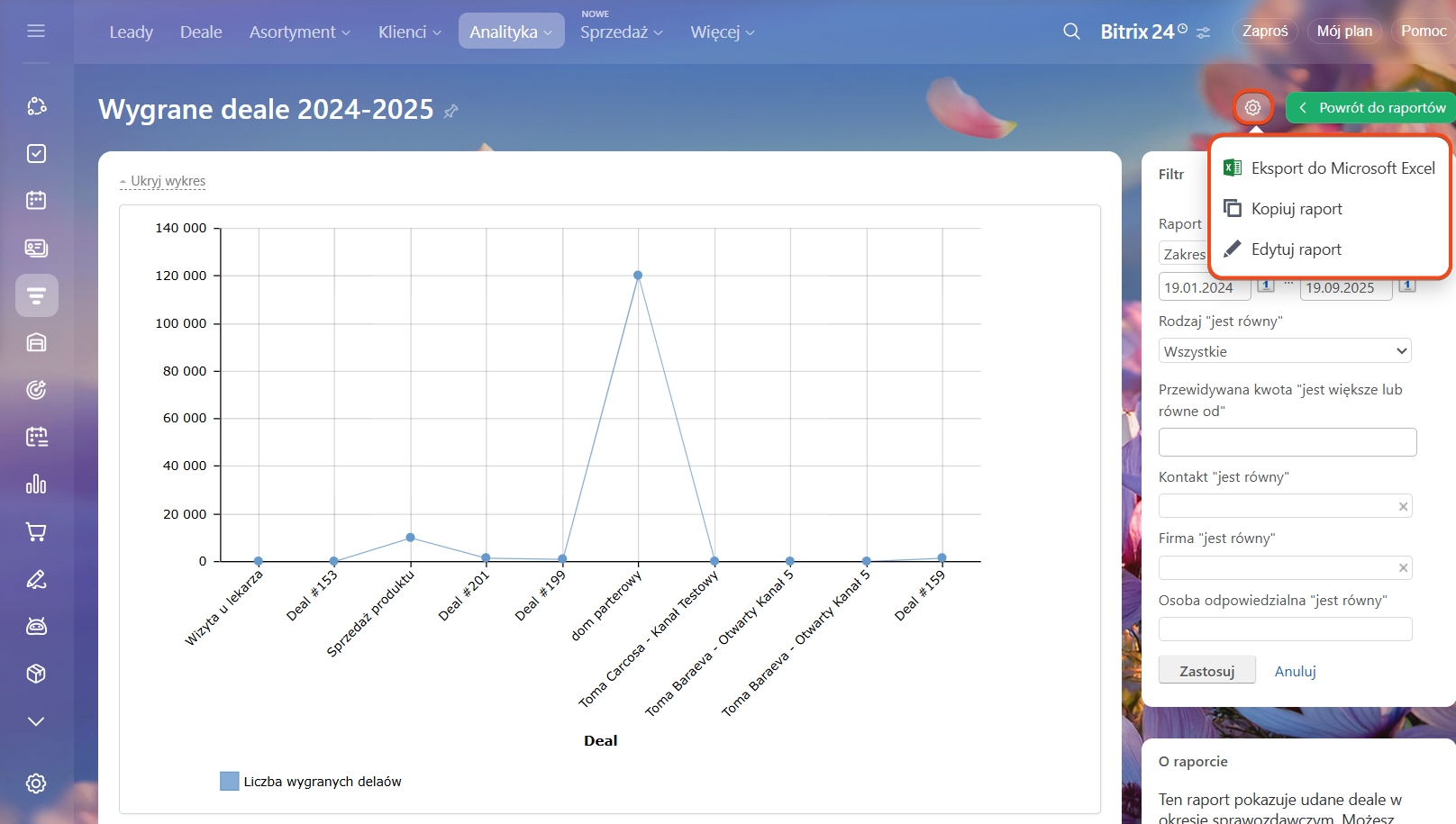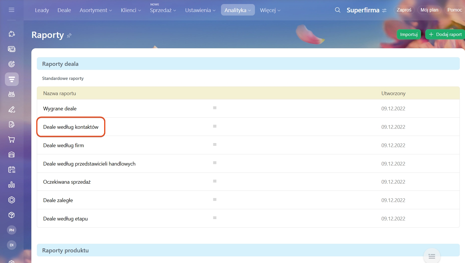 Za pomocą kreatora raportów w CRM menedżerowie mogą ocenić, jak firma się rozwija, jakie zyski przynieśli menedżerowie i jaki produkt najlepiej się sprzedaje.