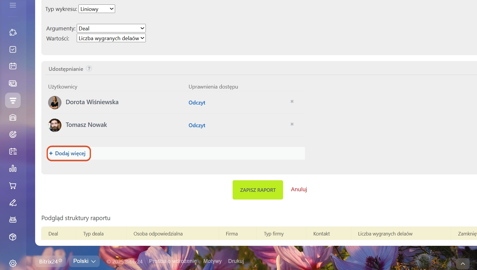 Jeśli chcesz udostępnić raport współpracownikom, kliknij przycisk Dodaj więcej w sekcji Udostępnianie i wybierz potrzebnych pracowników. Nie udostępniasz danych, a jedynie wyświetlasz szablon raportu.