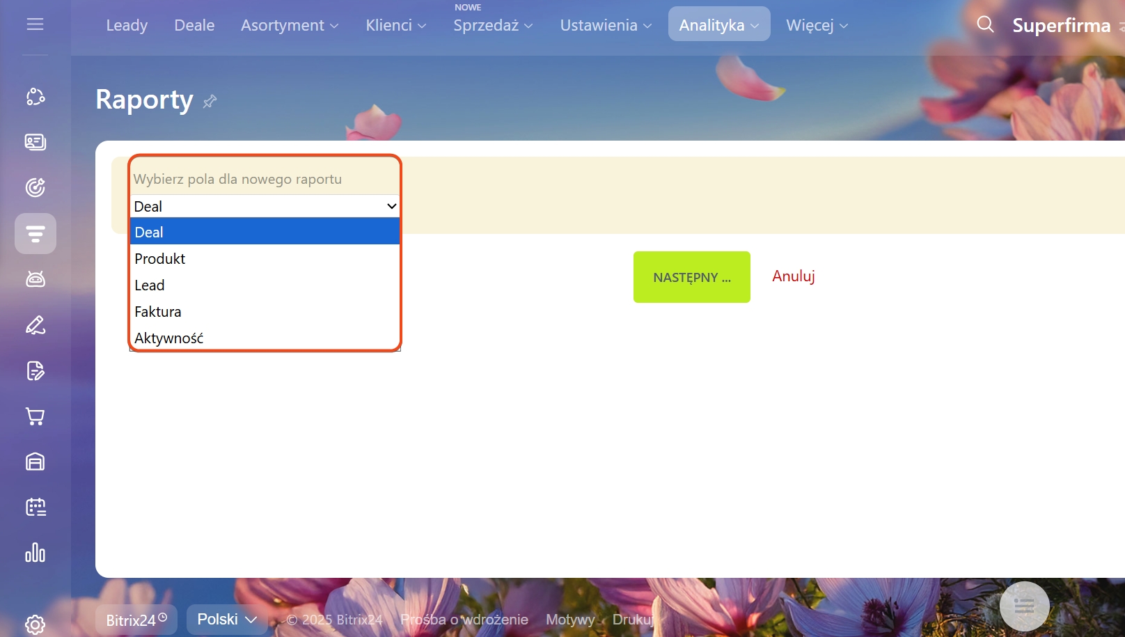 Wybierz zestaw pól w raporcie. Obecnie raport można budować dla deali, produktów, leadów, faktur i działań.