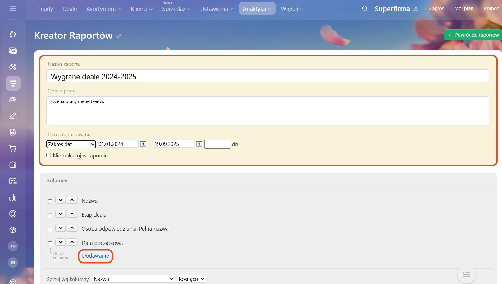 W formularzu wpisz nazwę raportu, opis, okres raportowania i dodaj potrzebne kolumny.