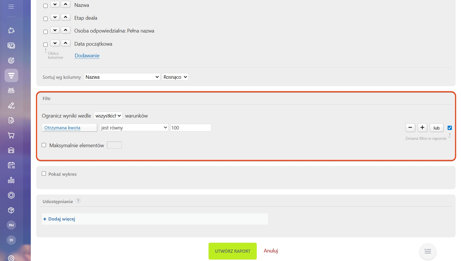Możesz także dodać filtry, aby ograniczyć wyniki wyszukiwania. Na przykład w raporcie podaliśmy dodatkowy parametr: otrzymana kwota jest większa od 100