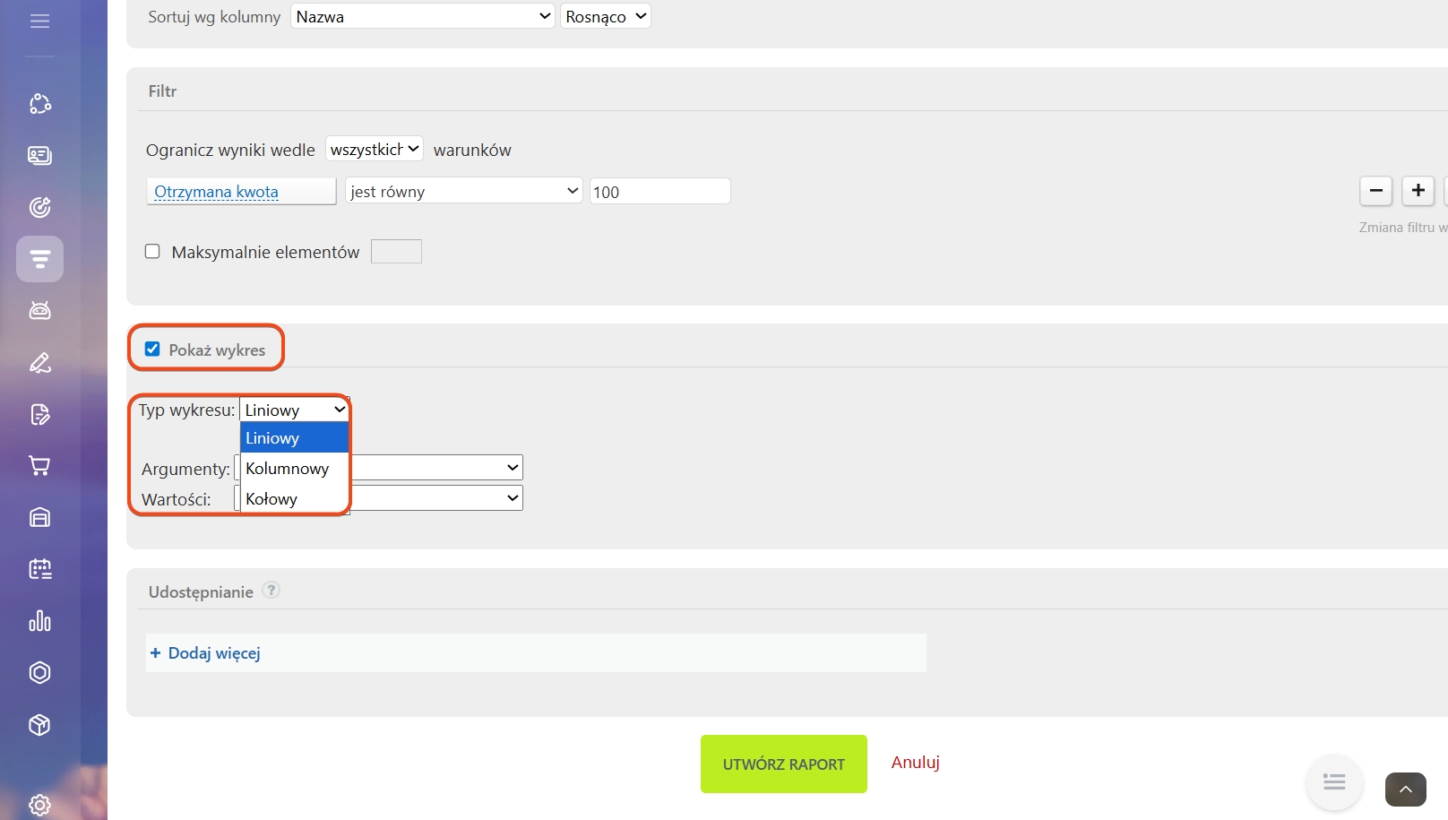 Aby zbudować wykres w raporcie, zaznacz opcję Pokaż wykres.
