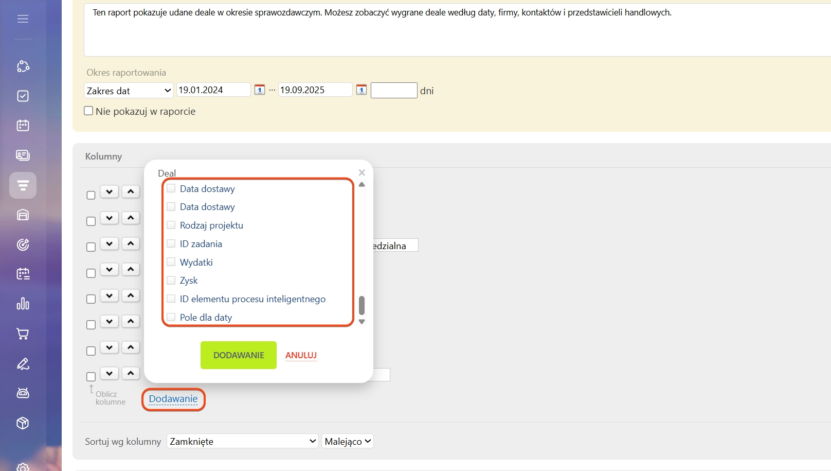 W raportach możesz używać niestandardowych pól CRM. Będą dostępne podczas konfigurowania kolumn raportu.