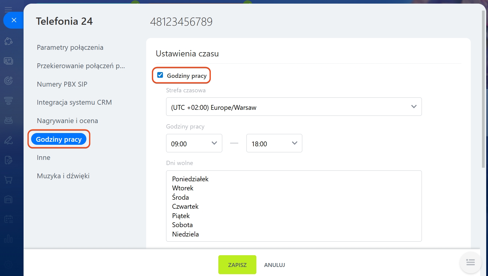 Możesz skonfigurować godziny pracy dla wynajmowanego numeru lub centrali PBX w sekcji Telefonia> Konfiguruj numery> wybierz numer/PBX.