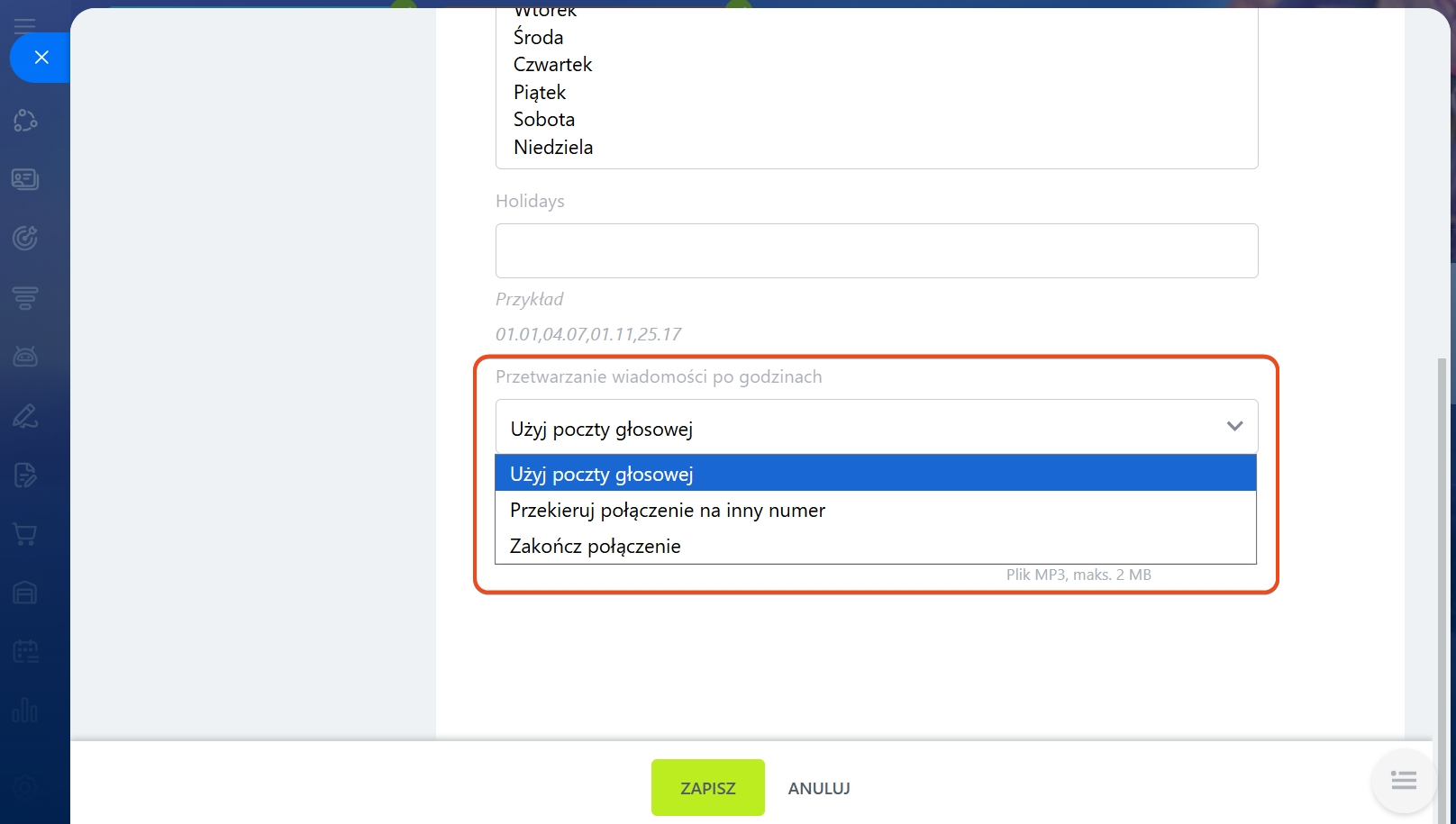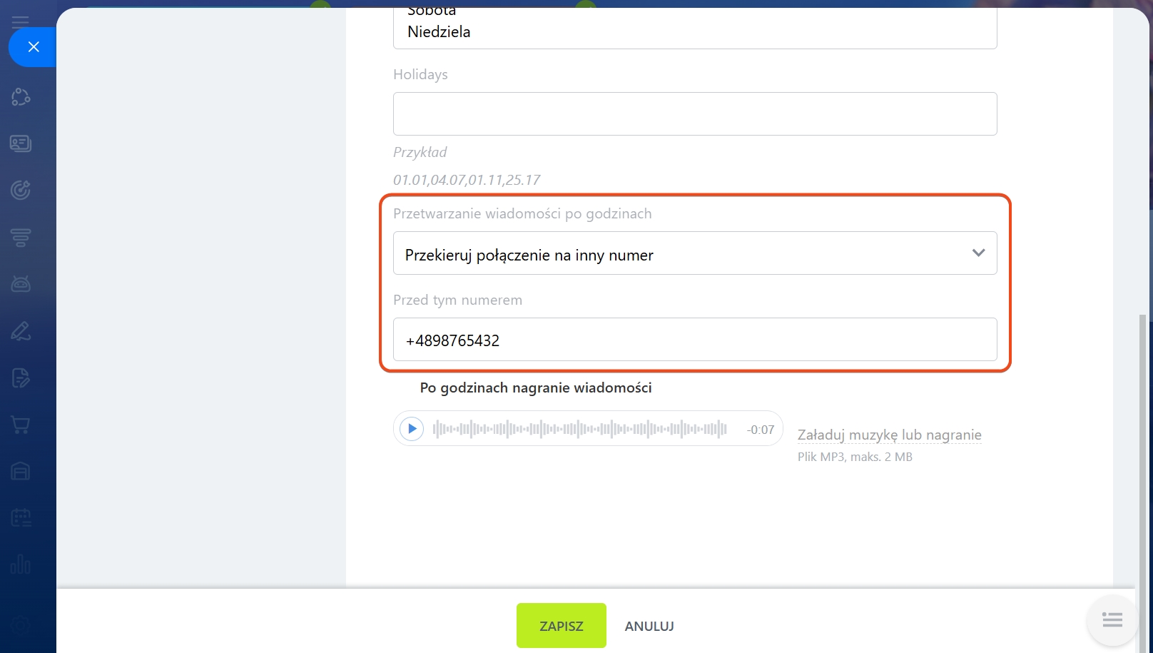 - Przetwarzanie wiadomości po godzinach - wybierz sposób przetwarzania połączeń poza godzinami pracy.
