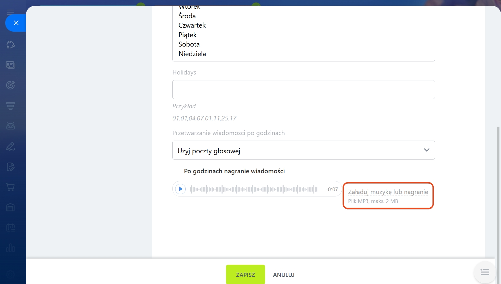 - Po godzinach nagranie wiadomości - możesz wybrać melodię lub nagranie, którą usłyszy klient, jeśli zadzwoni poza godzinami pracy.