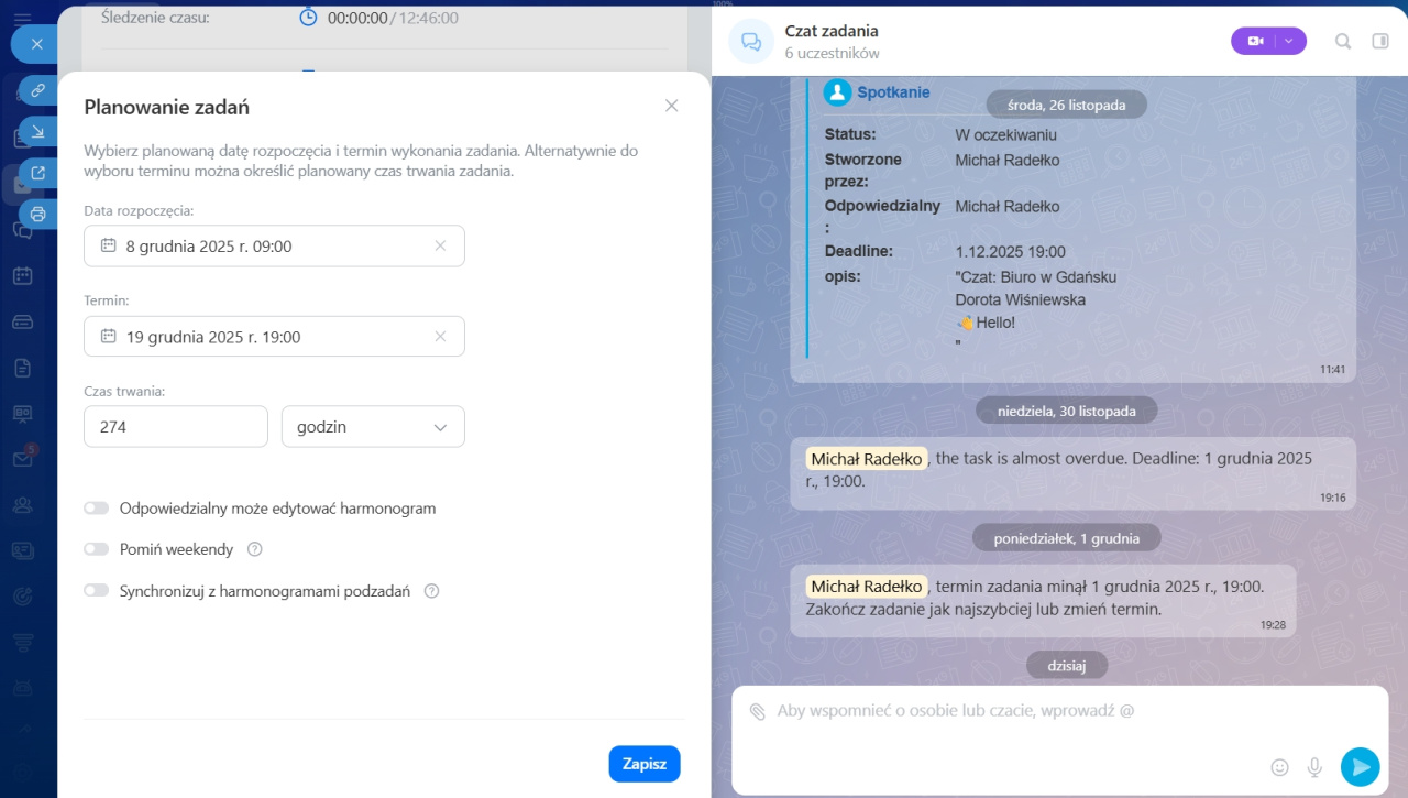 Domyślnie czas trwania zadania nie obejmuje godzin pracy Twojej firmy. Zaznacz pole wyboru Pomiń weekendy i święta, a daty zadania zostaną przeniesione na najbliższe godziny pracy.
