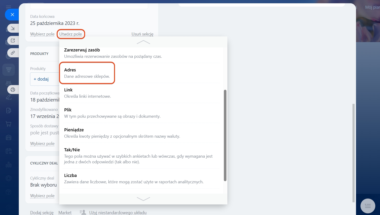 Aby dodać mapę do elementu CRM, kliknij Utwórz pole i wybierz pole typu Adres.