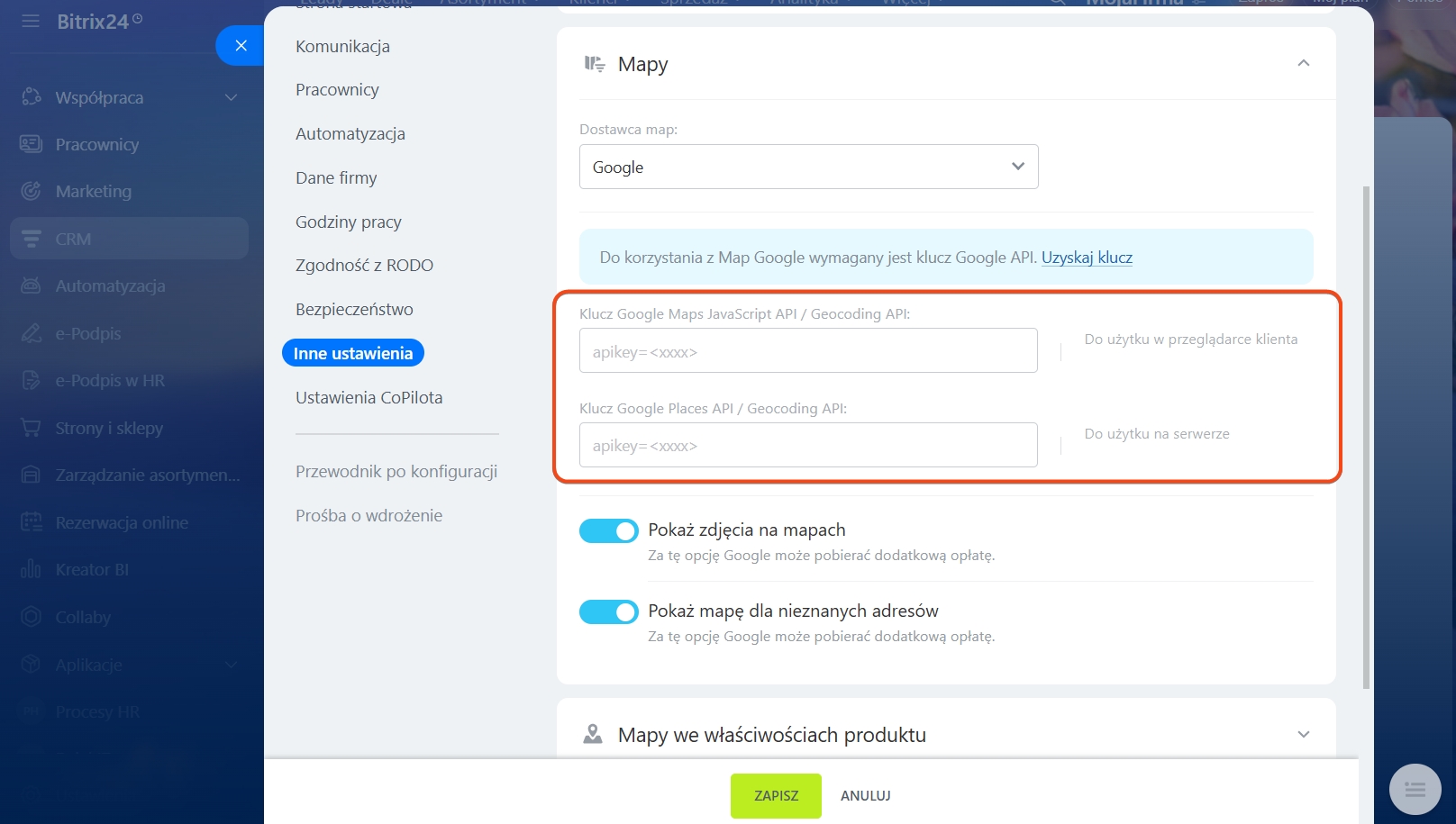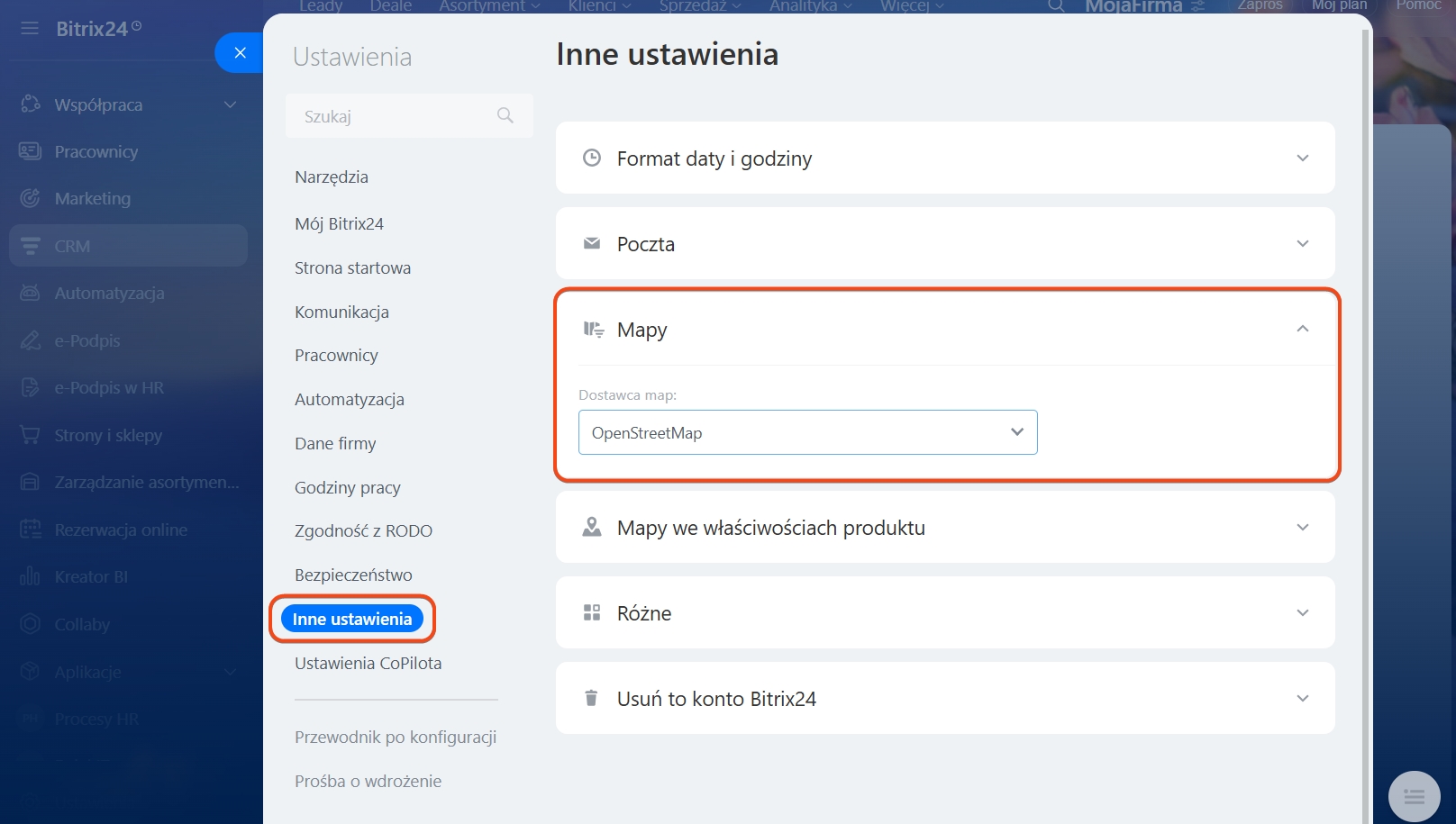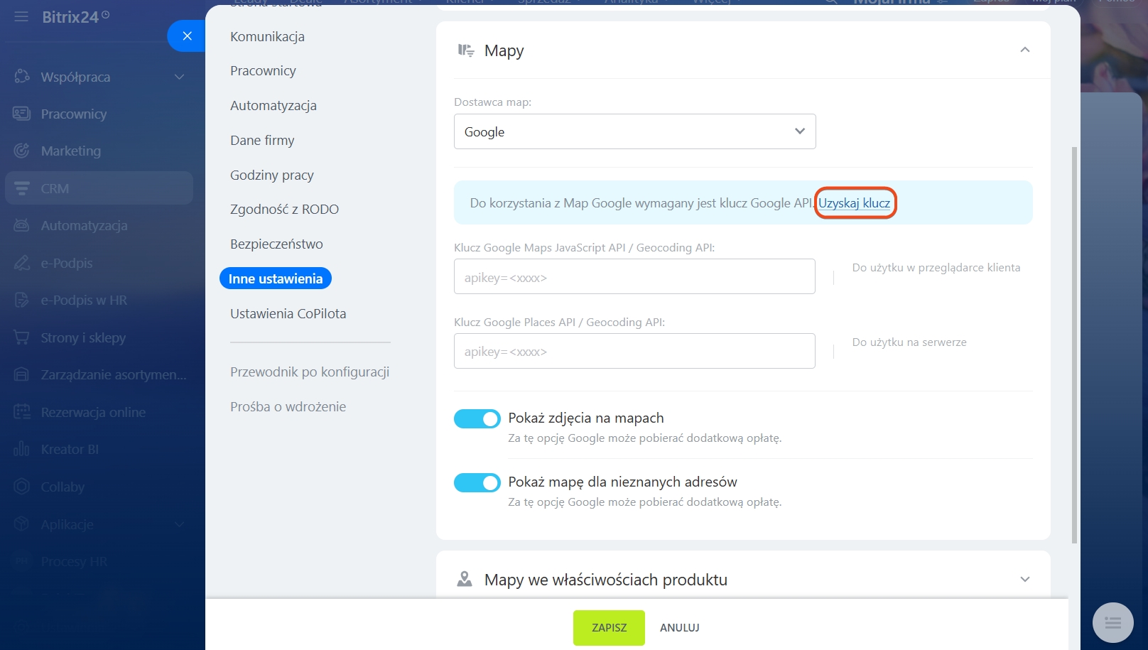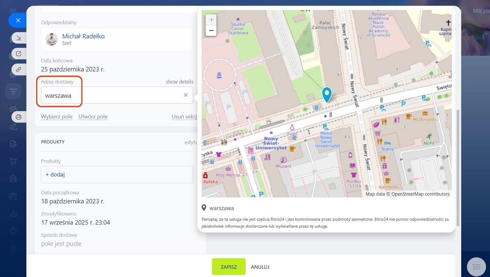 Domyślnie w Bitrix24 używany jest OpenStreetMap, możesz jednak podłączyć Mapy Google.