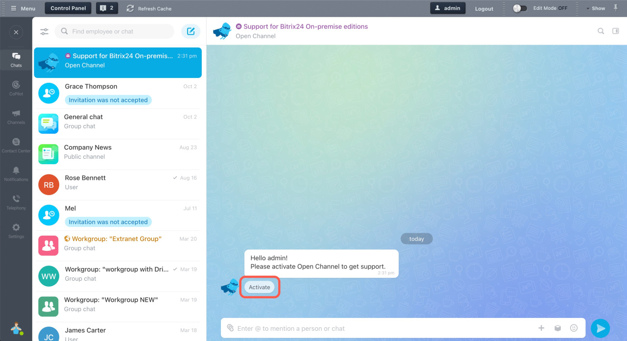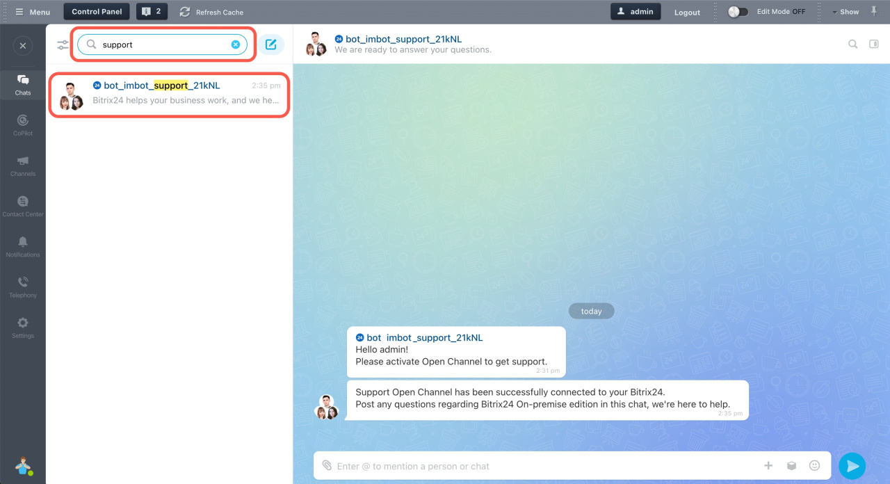 Następnie musisz aktywować chatbota Support for Bitrix24 On-Premise editions w oknie czatu: