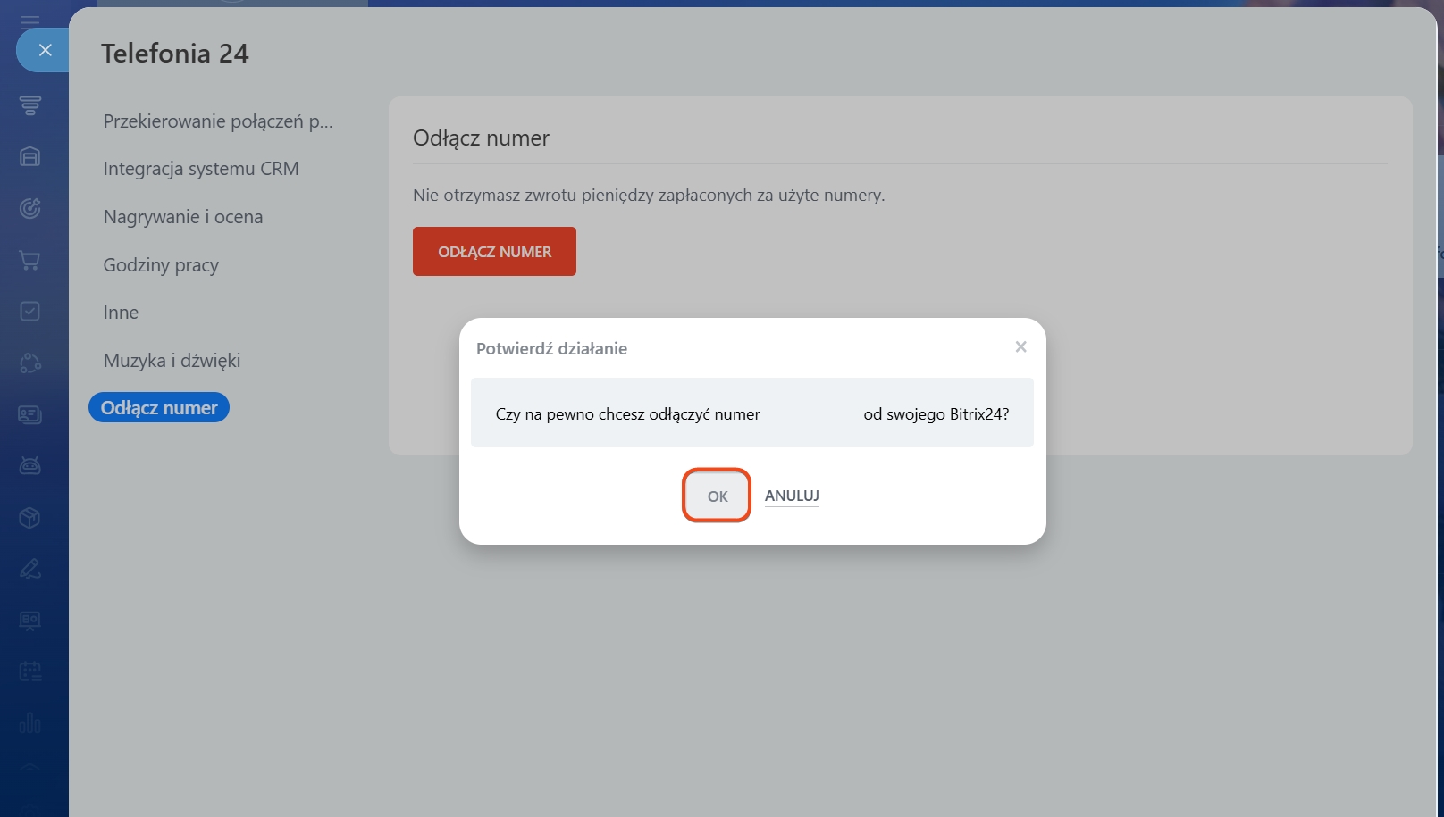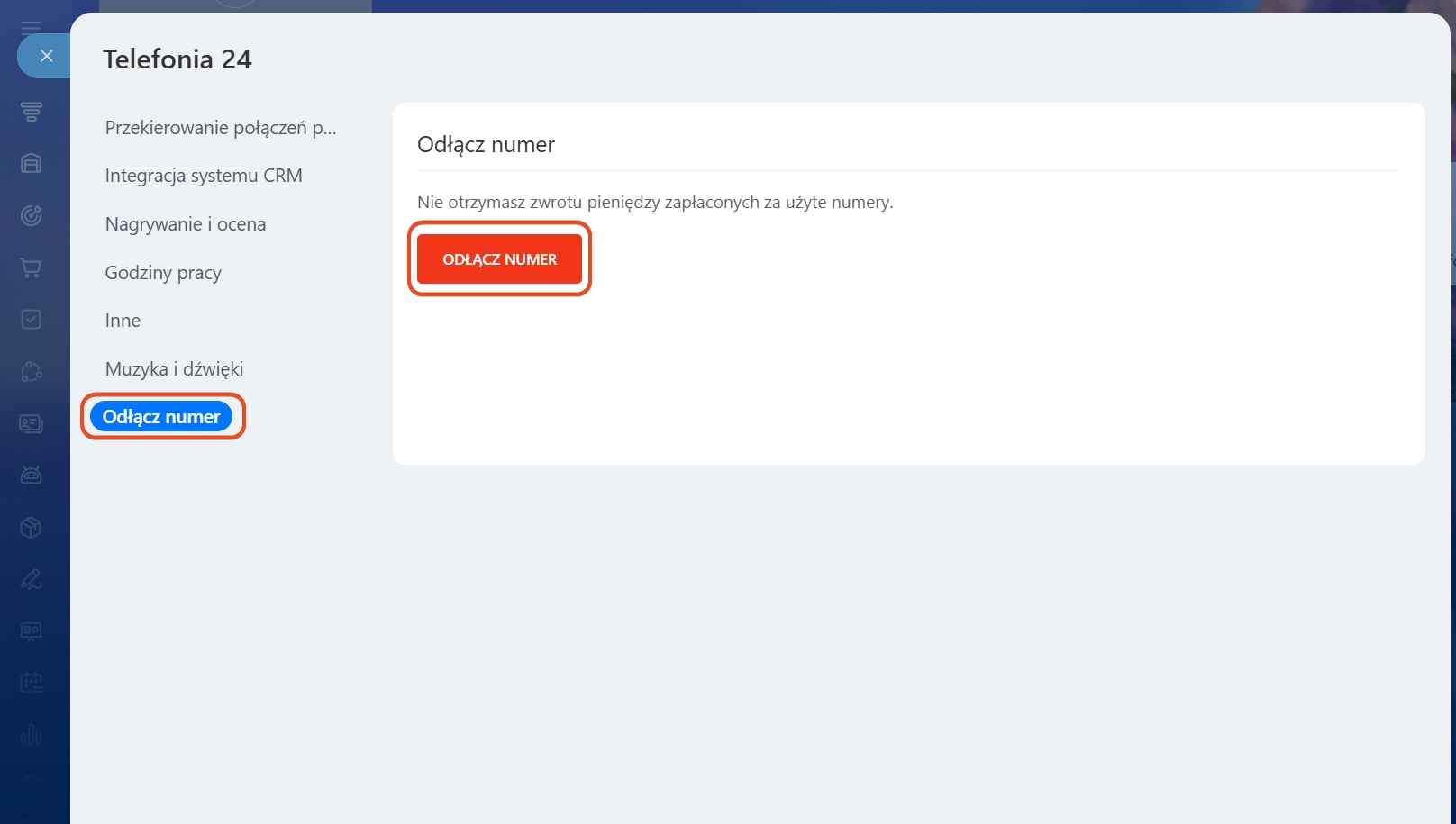 Aby odłączyć wynajmowany numer, przejdź do sekcji Telefonia> Połączenie> Konfiguruj numery> wybierz numer, który chcesz odłączyć.