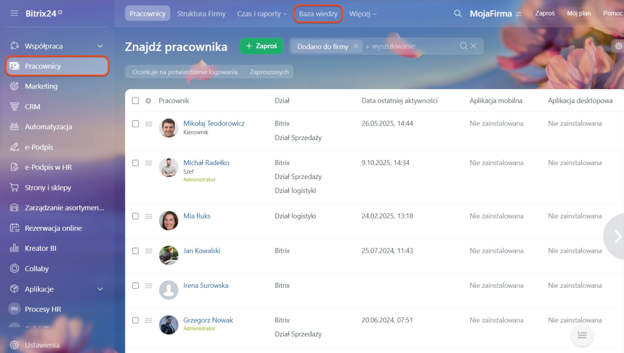 Listę Baz Wiedzy można znaleźć w sekcji Pracownicy > Baza Wiedzy.