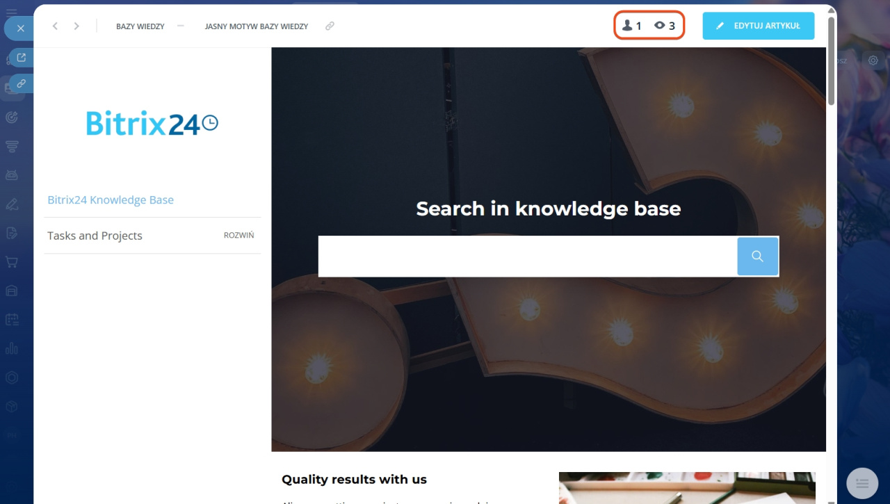Bazy Wiedzy mają teraz licznik wyświetleń artykułów, który pokazuje liczbę unikalnych użytkowników dla każdej strony Bazy Wiedzy. Oznacza to, że licznik będzie liczył tylko pierwszą wizytę na stronie Bazy Wiedzy. Na przykład Baza Wiedzy zawiera regulaminy pracy. Możesz się dowiedzieć, który z Twoich pracowników zapoznał się z informacjami na stronie i komu należy o tym przypomnieć.