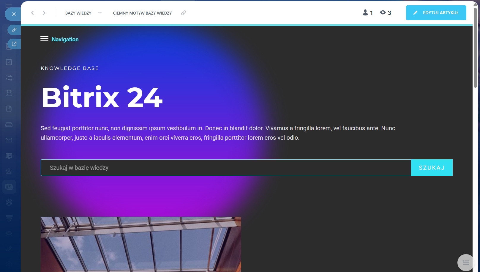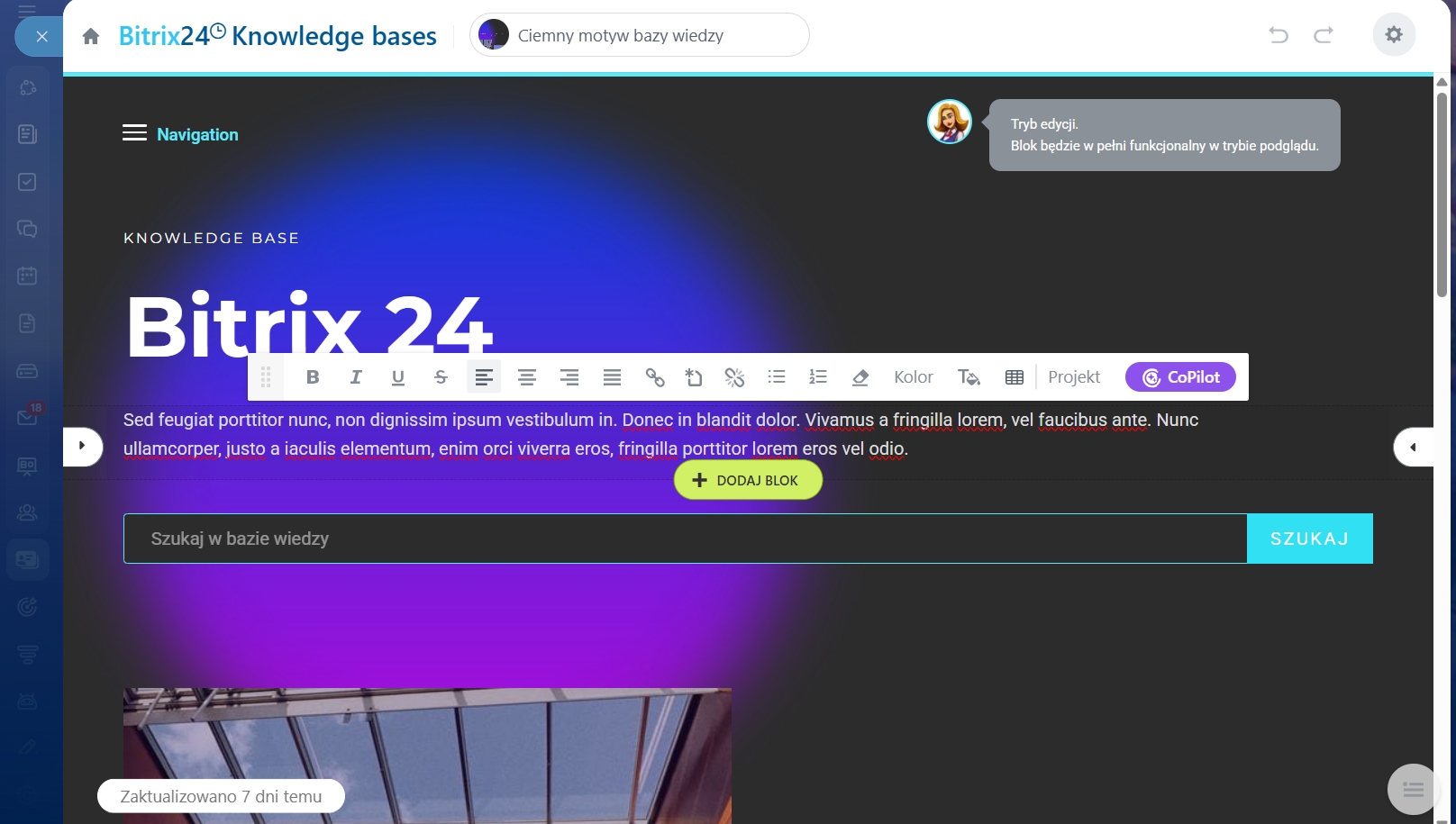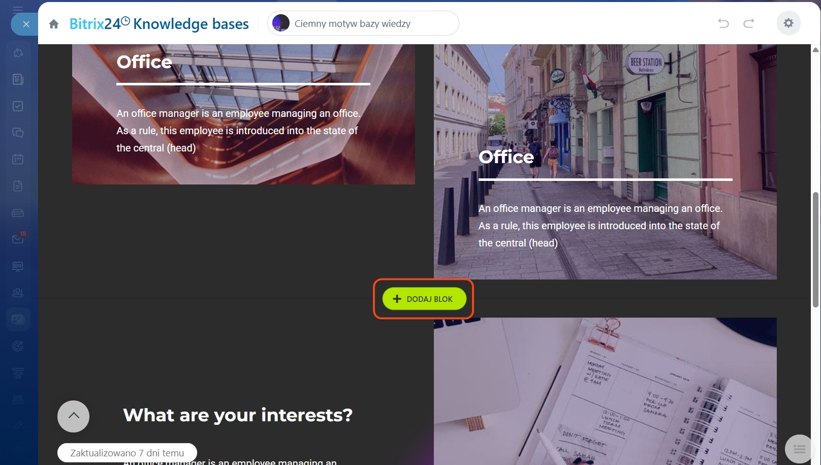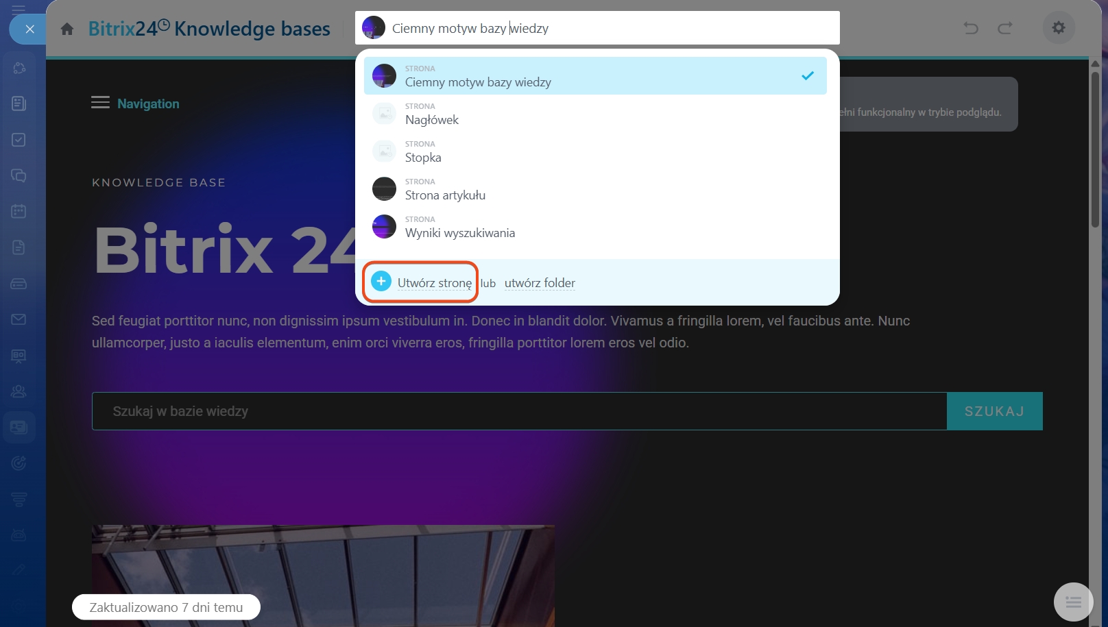 Baza Wiedzy składa się z kilku połączonych ze sobą stron. Na stronach możesz umieszczać bloki z informacjami, obrazami, filmami i innymi elementami. Wszystkie strony Bazy Wiedzy są wyświetlane w menu.
