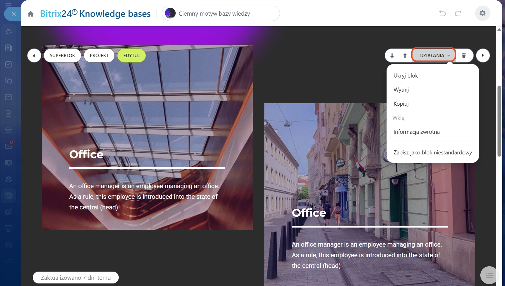 Bloki można ukrywać, kopiować, wycinać, wklejać i zapisywać na liście bloków. Znajdziesz te opcje w menu Działania.