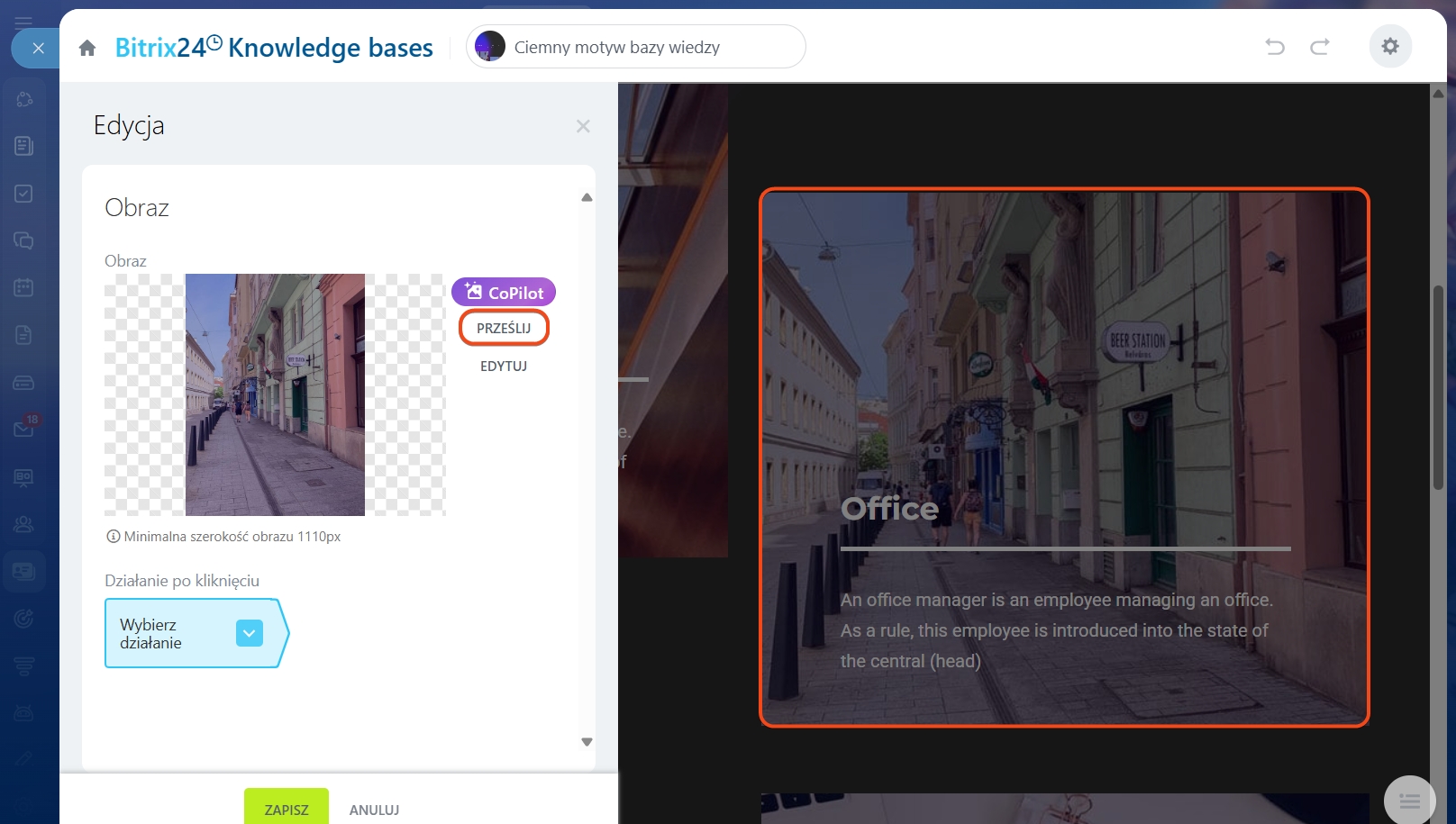 Kliknij obraz w bloku. Otworzy się formularz, w którym możesz przesłać nowy obraz.