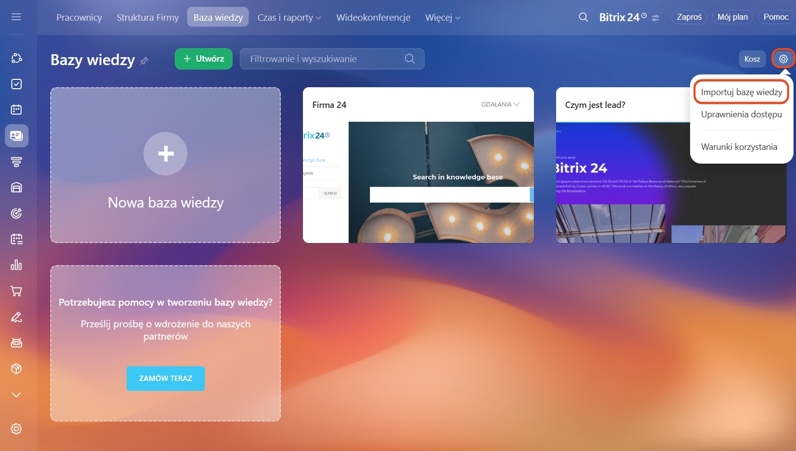 Przejdź do innego konta Bitrix24. Otwórz sekcję Firma> Baza Wiedzy> kliknij koło zębate i wybierz Importuj Bazę Wiedzy.