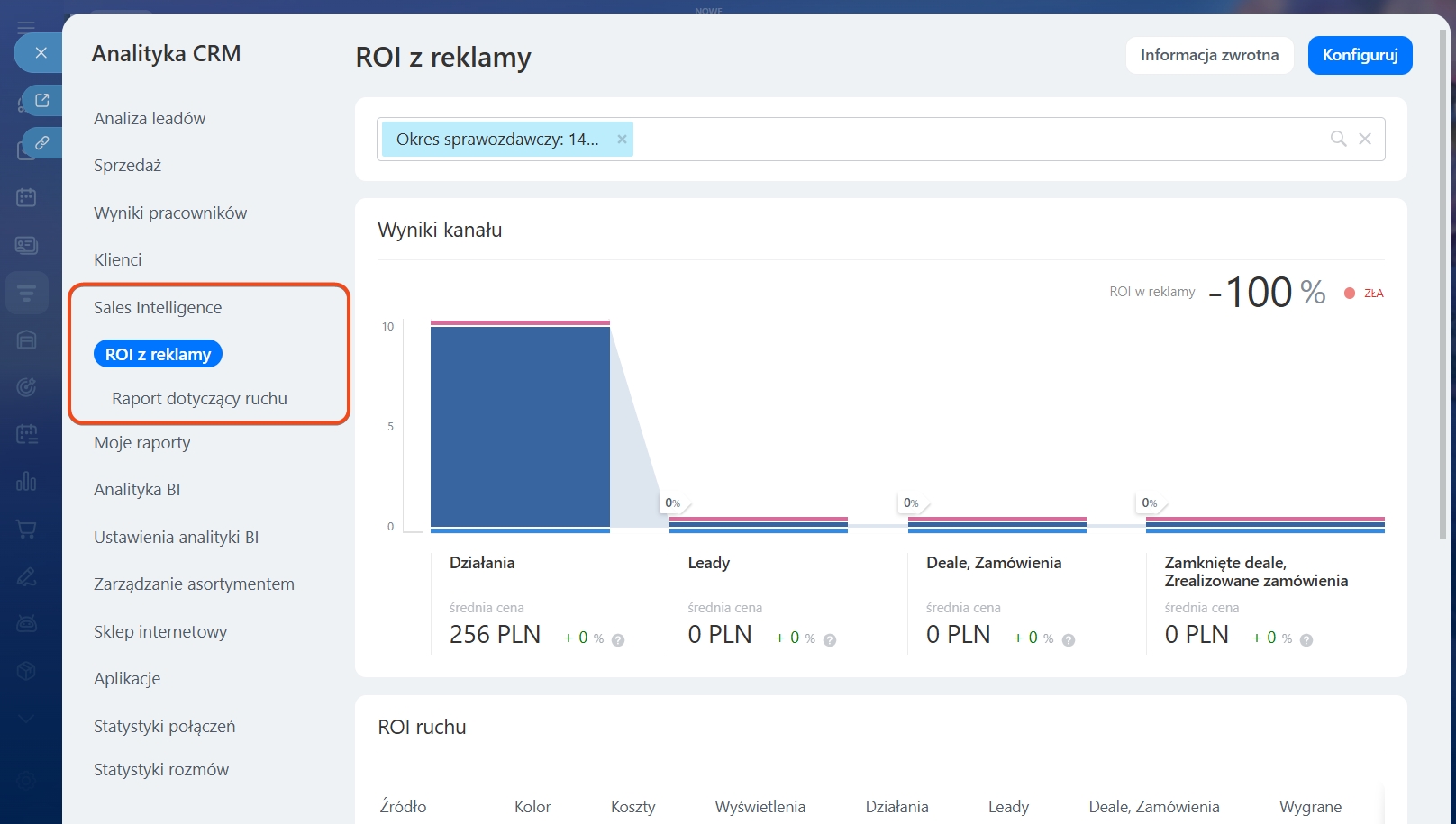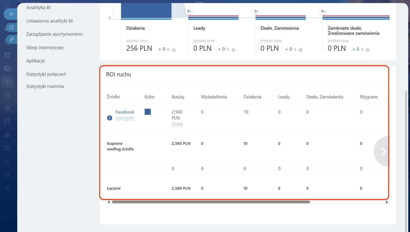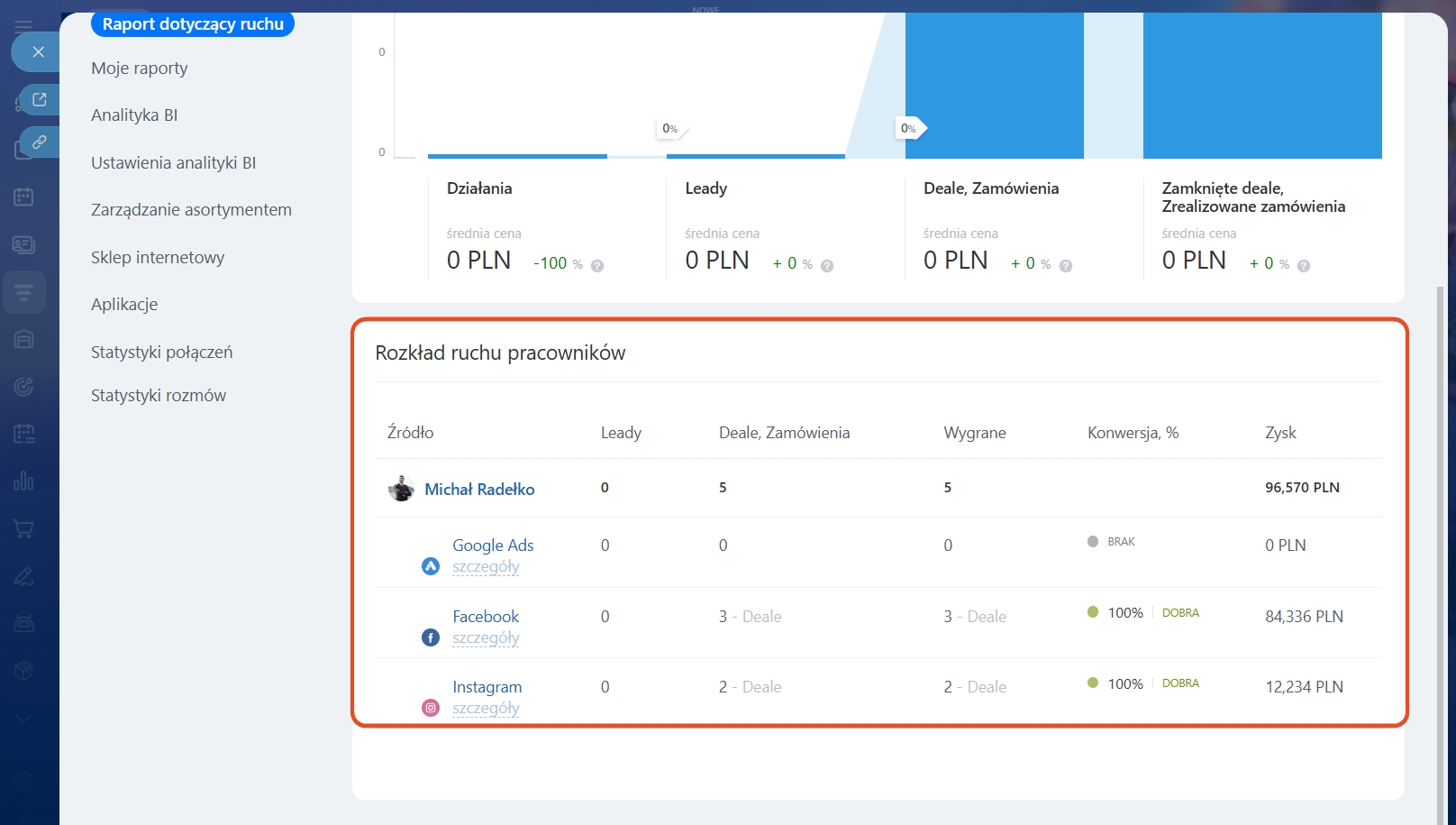 Tutaj możesz zobaczyć wykres podzielony na części. Każda część reprezentuje określone źródło ruchu. Możesz także wyświetlić współczynnik konwersji sprzedaży.