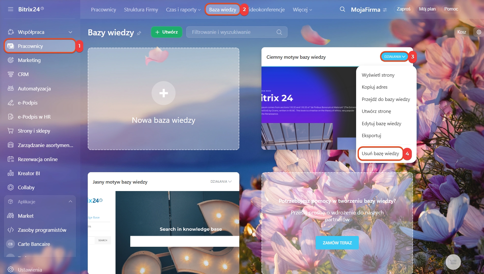 Aby usunąć Bazę Wiedzy, przejdź do odpowiedniej sekcji, kliknij Działania i wybierz Usuń Bazę Wiedzy.