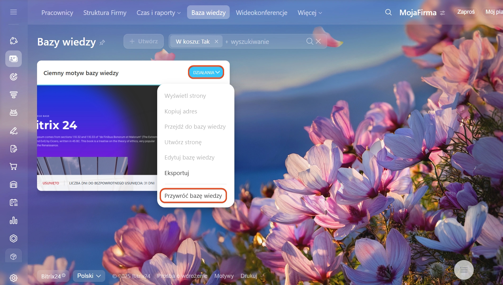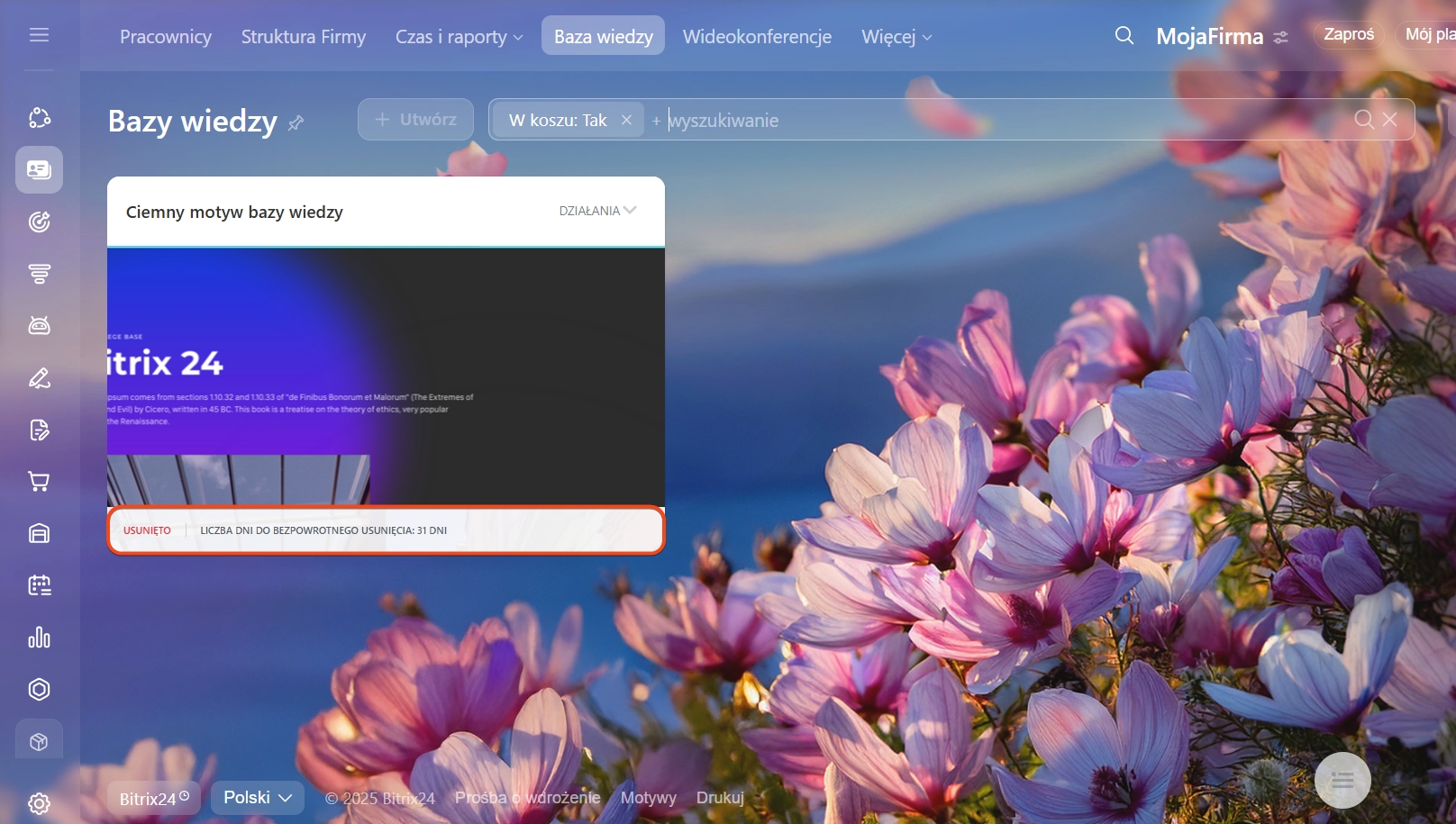 Po usunięciu Baza Wiedzy trafia do kosza i znajduje się tam przez 30 dni. Możesz przejść do kosza, używając filtru lub klikając przycisk Kosz.