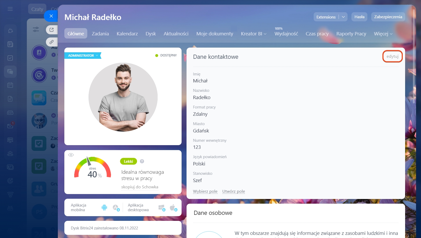 Profil można edytować w dowolnym momencie — zarówno przez pracownika, jak i administratora Bitrix24.