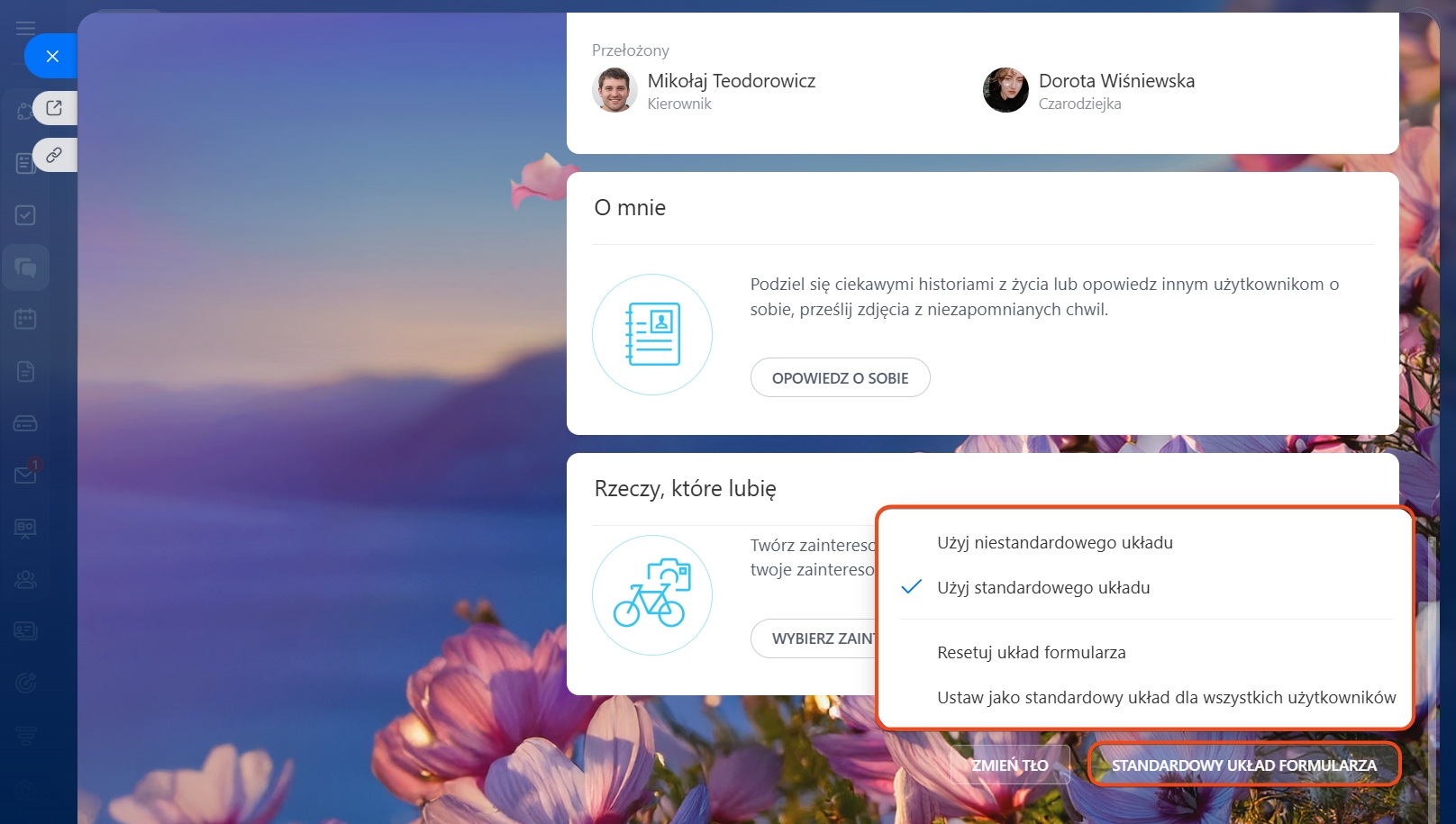 Dostosuj widok formularza. Możesz wybrać, które pola i w jakiej kolejności mają być wyświetlane w profilu. W tym celu włącz Użyj niestandardowego układu. Aby powrócić do widoku skonfigurowanego przez administratora, wybierz Użyj standardowego układu.