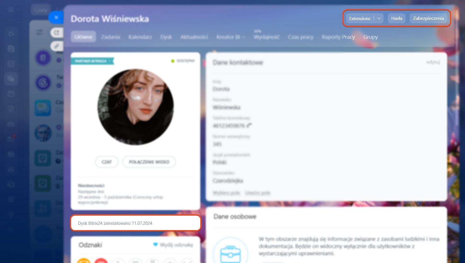 Profil w Bitrix24 to cyfrowa wizytówka pracownika, która umożliwia współpracownikom szybkie uzyskanie informacji o jego roli w firmie, danych kontaktowych, zainteresowaniach i innych szczegółach.