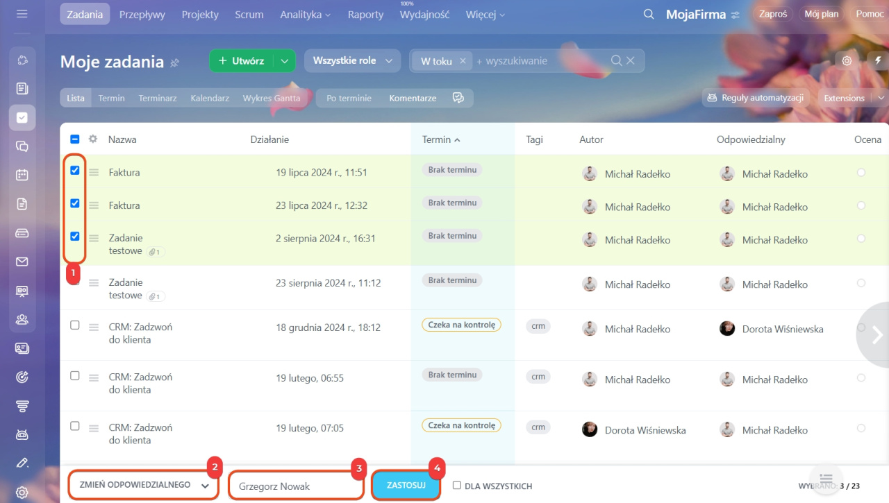 Otwórz stronę profilu zwolnionego pracownika kliknij Zadania> zaznacz wszystkie zadania użytkownika> wybierz opcję Zmień osobę odpowiedzialną> wskaż nową osobę odpowiedzialną> kliknij Zastosuj.
