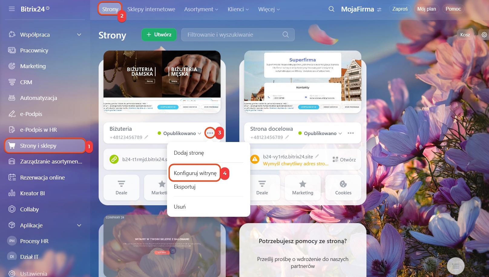 Przejdź do sekcji Strony> wybierz witrynę> kliknij Działania> Konfiguruj witrynę.