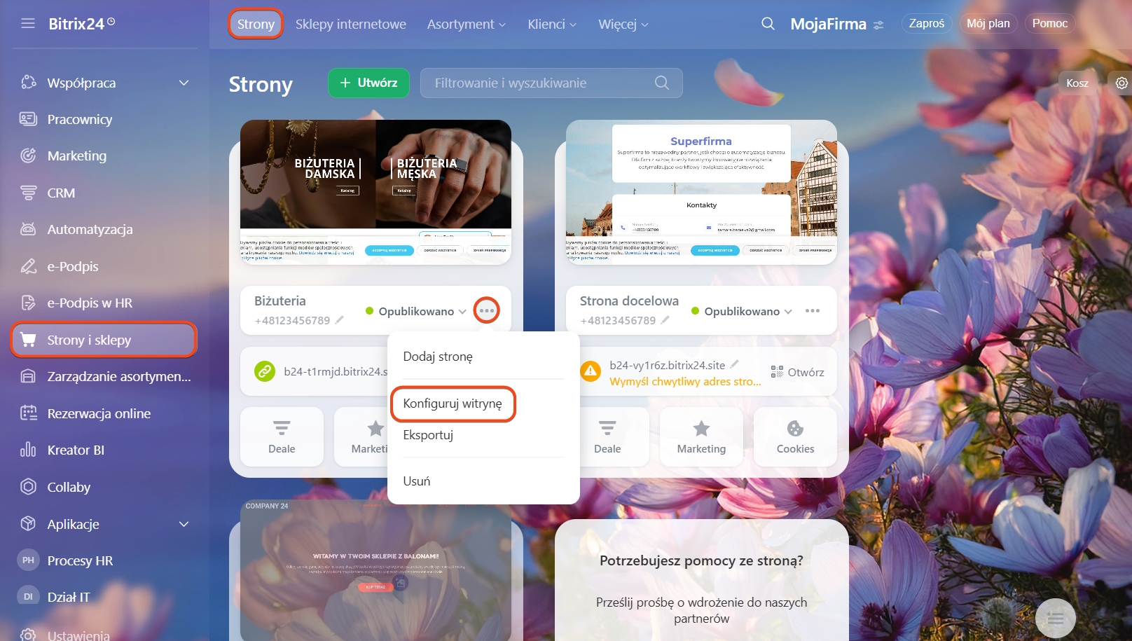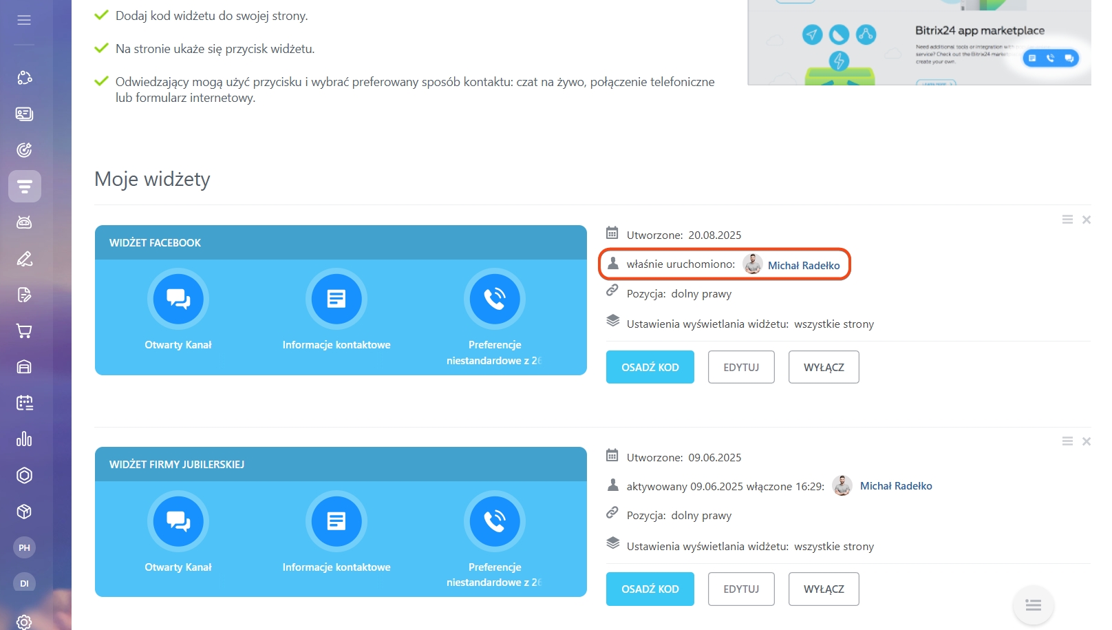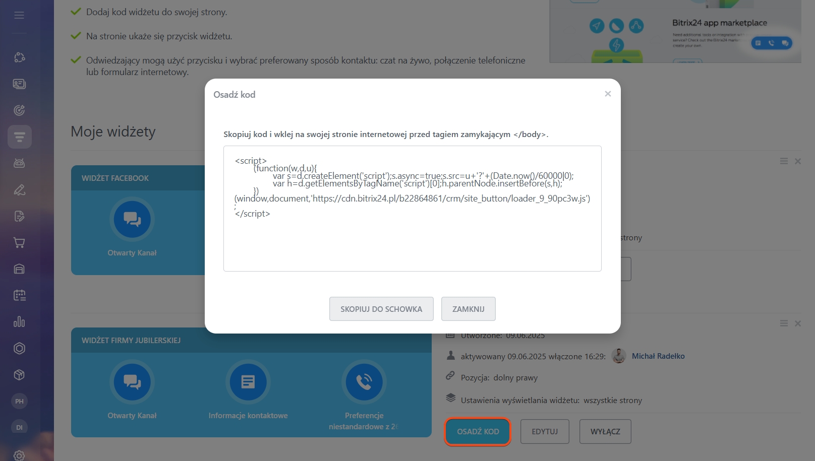 Aby to zrobić, ręcznie usuń kod ze swojej witryny. Najlepiej powierzyć to zadanie administratorowi lub deweloperowi witryny. Możesz zobaczyć, który kod usunąć w sekcji CRM > Sprzedaż > Kanały sprzedaży > Widget na stronie.
